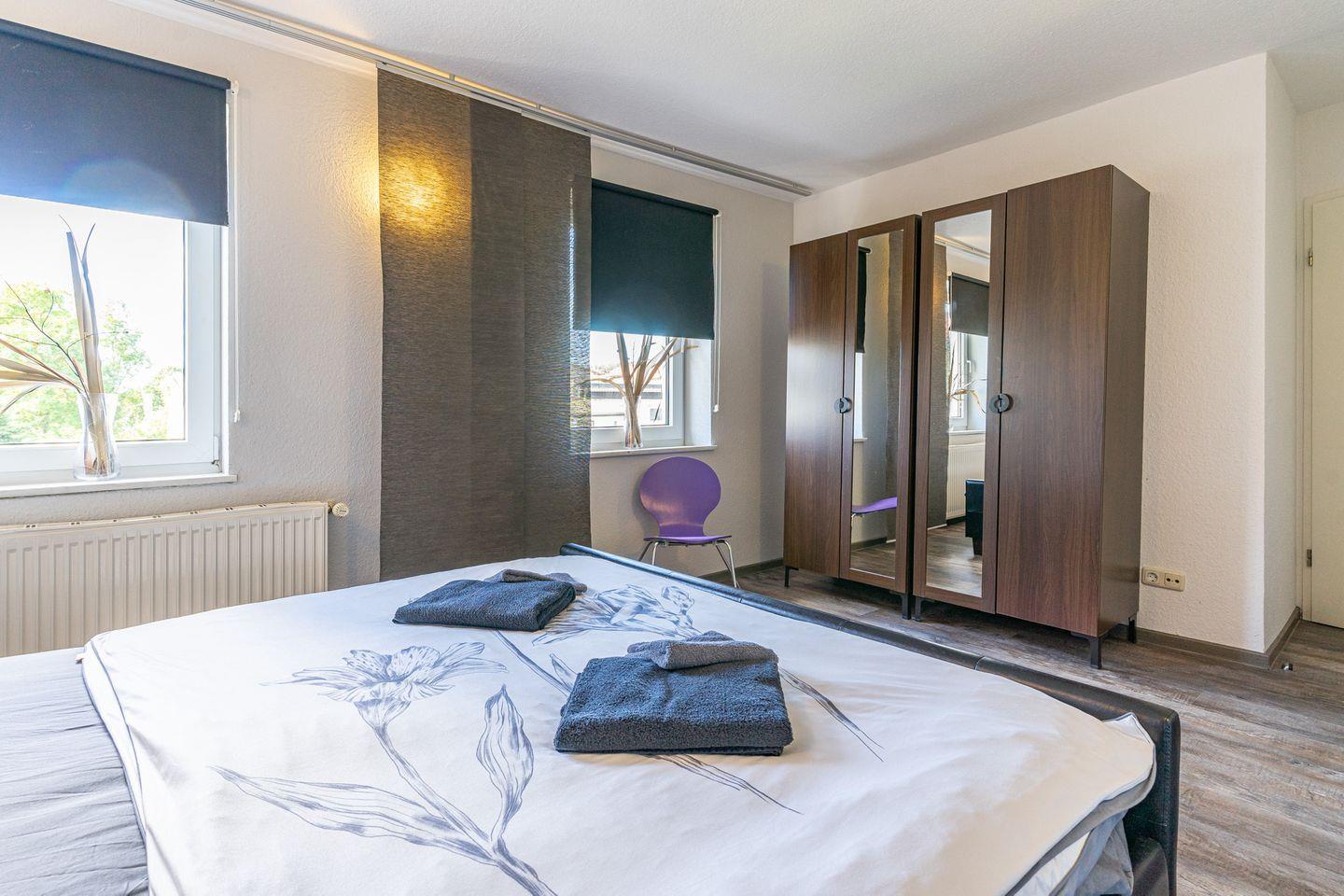 Im Schlafzimmer 1 gibt es ein Doppelbett (180/200 cm) sowie zwei Kleiderschränke mit Ganzkörperspiegeln.
