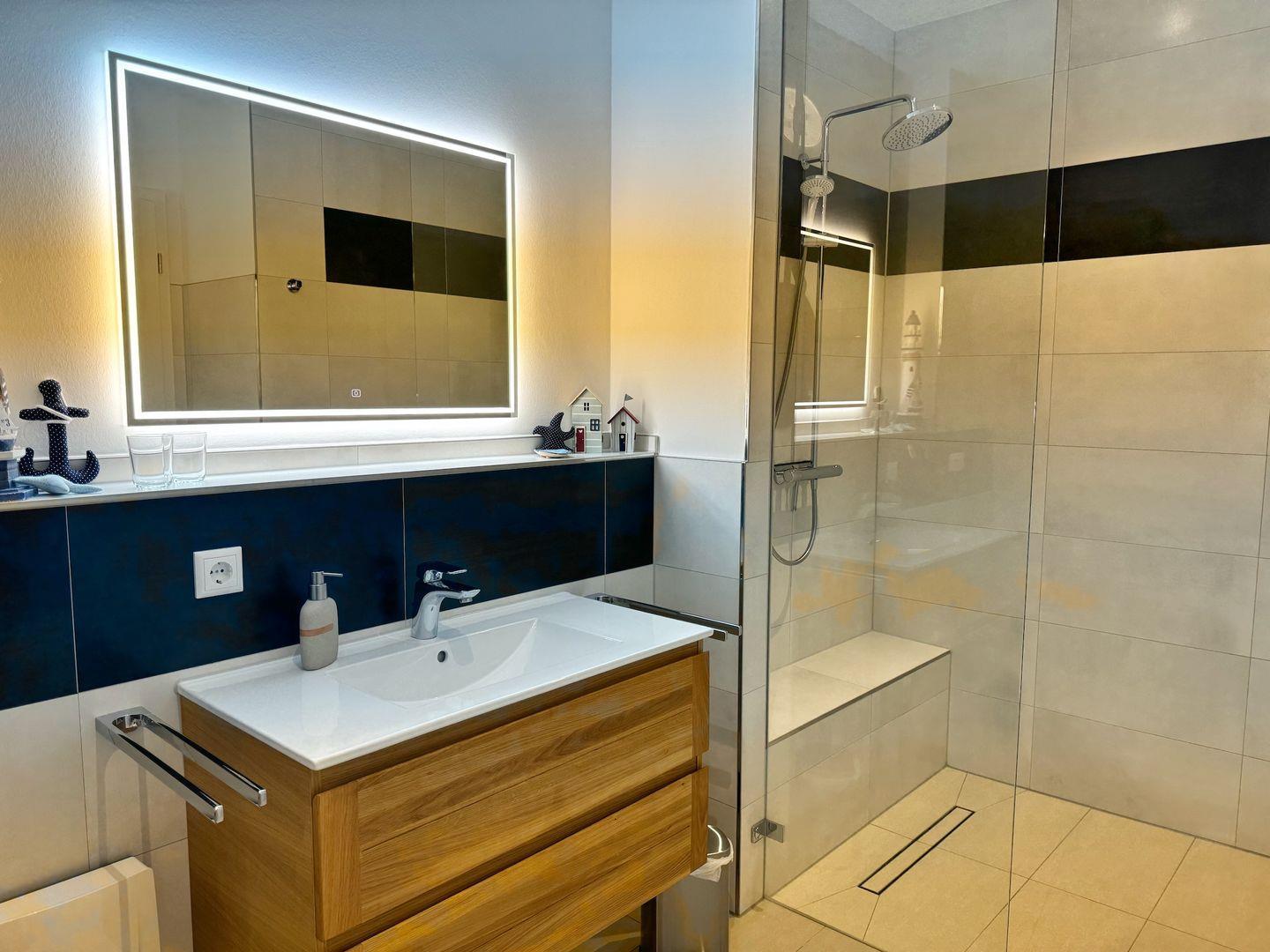 In das Wohn-Esszimmer ist eine moderne Einbauküche integriert. Die Küche ist komplett ausgestattet mit Geschirrspüler, Induktions-Herd, Backofen, Mikrowelle, Kühlschrank mit Gefriermöglichkeit und weiteren Selbstverständlichkeiten wie Kaffeemaschine, Wasserkocher und Toaster.