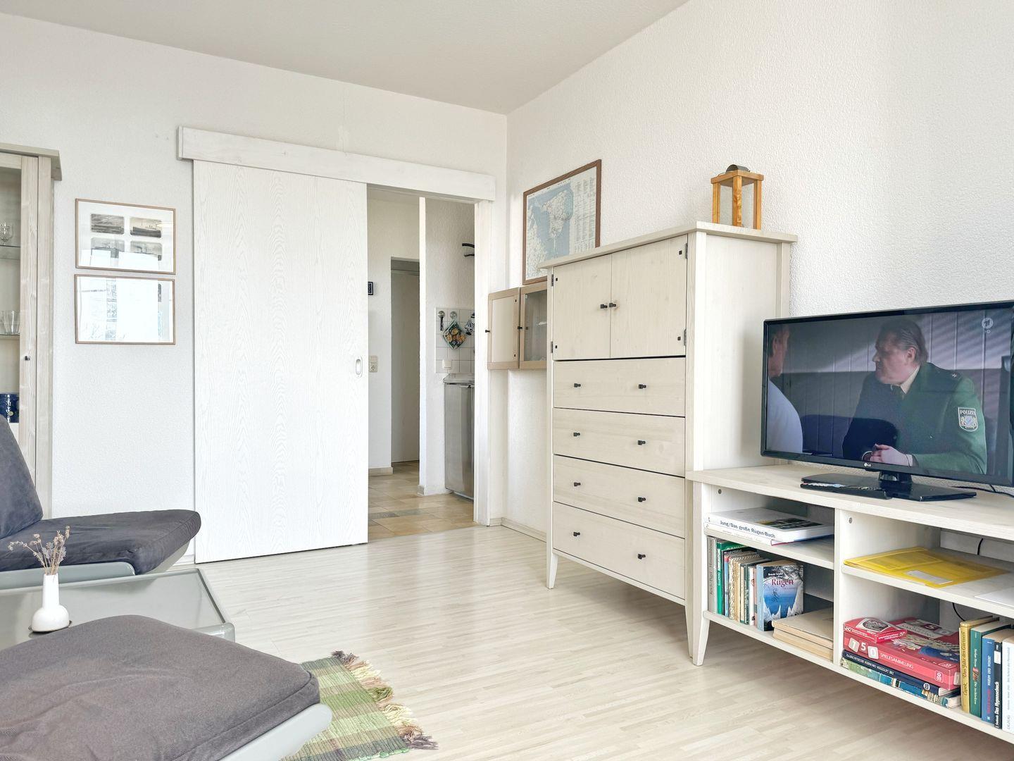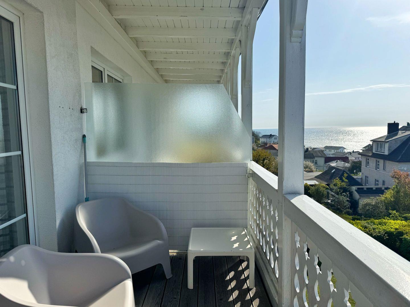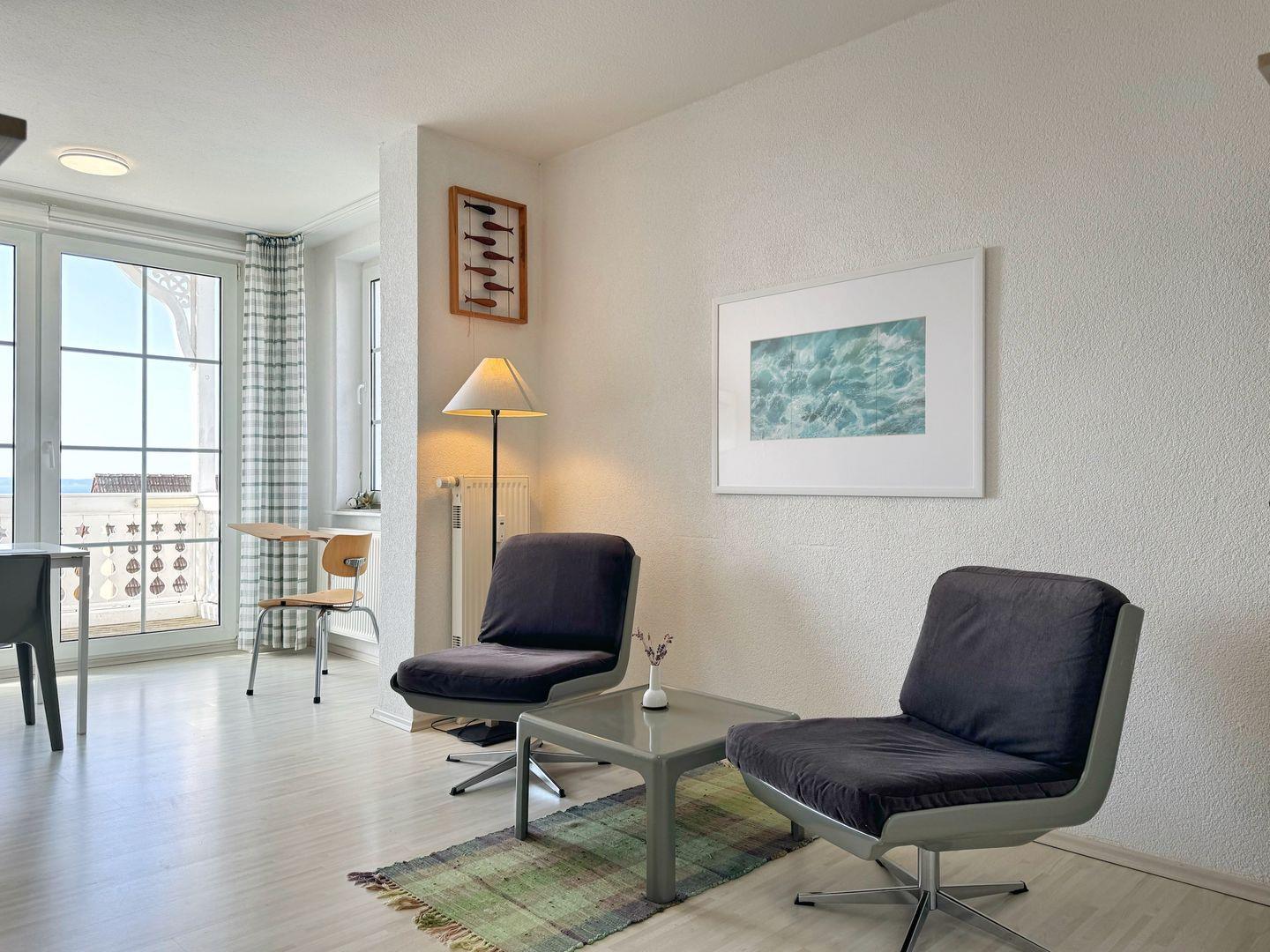Die hell und freundlich eingerichtete Ferienwohnung mit 42qm Wohnfläche besteht aus zwei Zimmern, einer offenen Miniküche und einem Tageslichtbad mit Dusche. Sie bietet Platz für 2 Personen. Vom Balkon im historischen Bäderstil haben Sie einen herrlichen Meerblick.