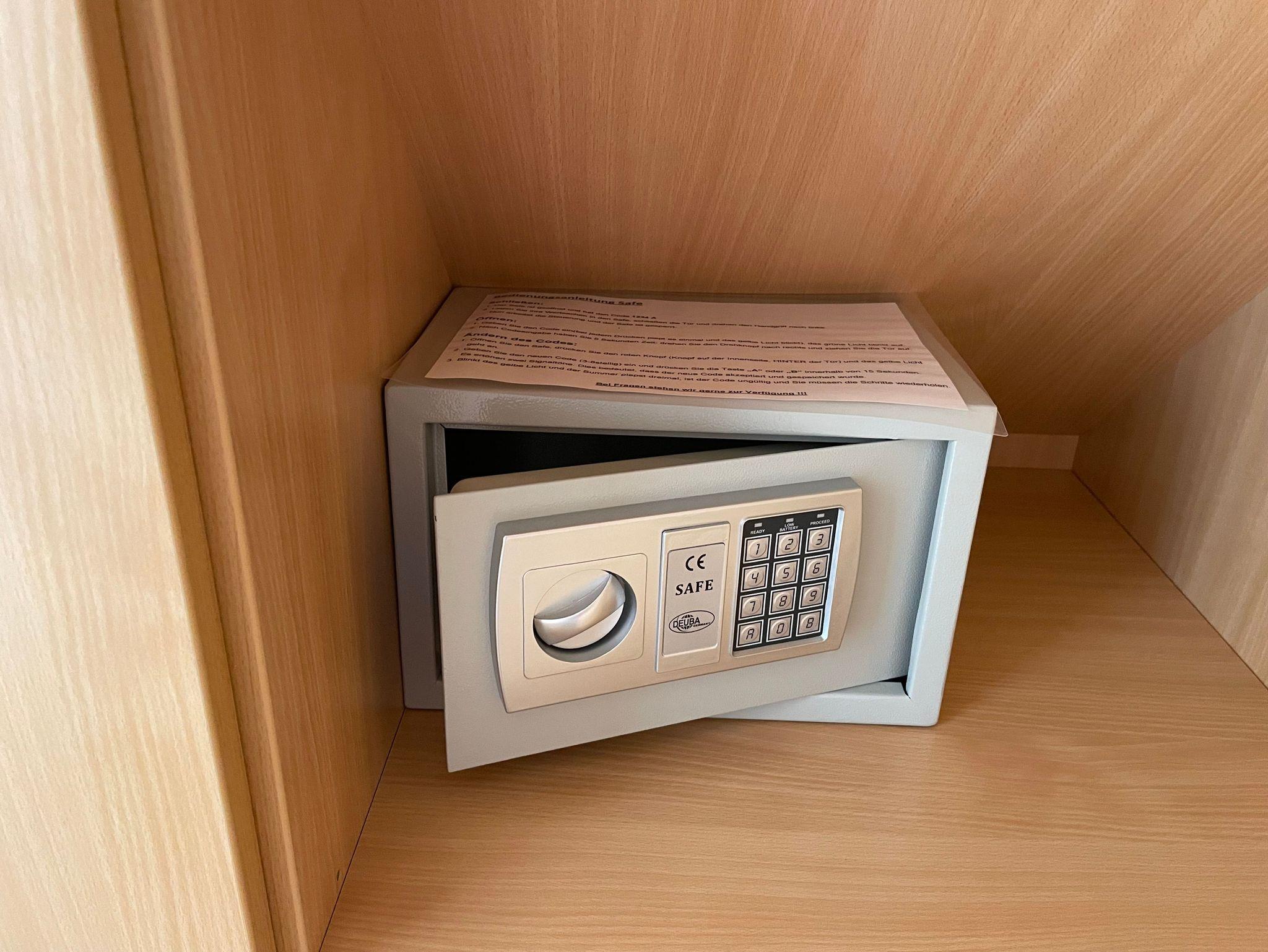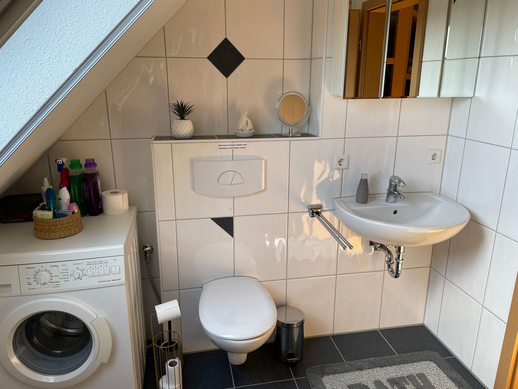 • Im Bad finden sie eine Waschmaschine plus Wäscheständer und Wäschekorb