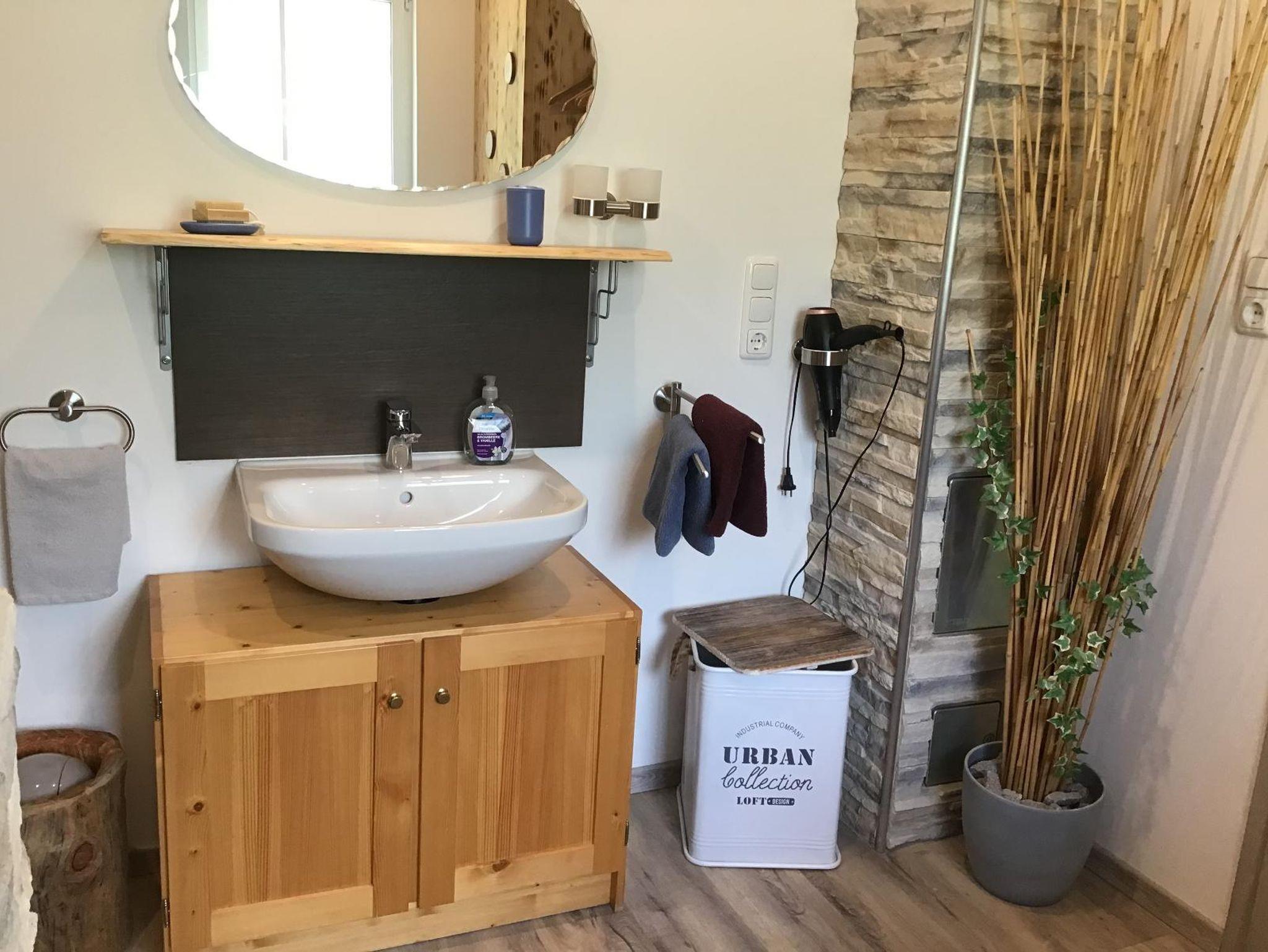 zusätzlichem Holzofen und ein großes Bad mit Dusche und WC. Eine