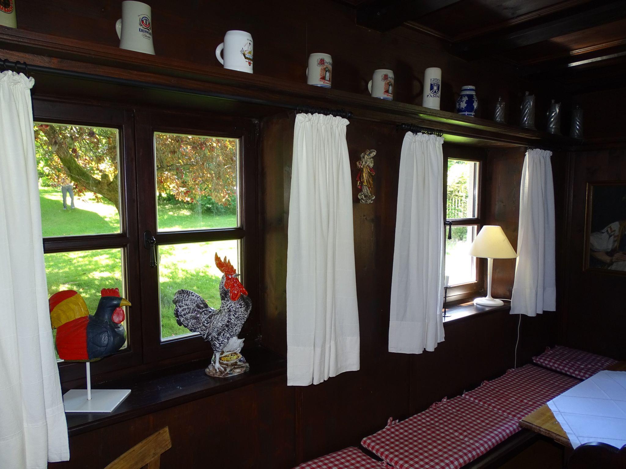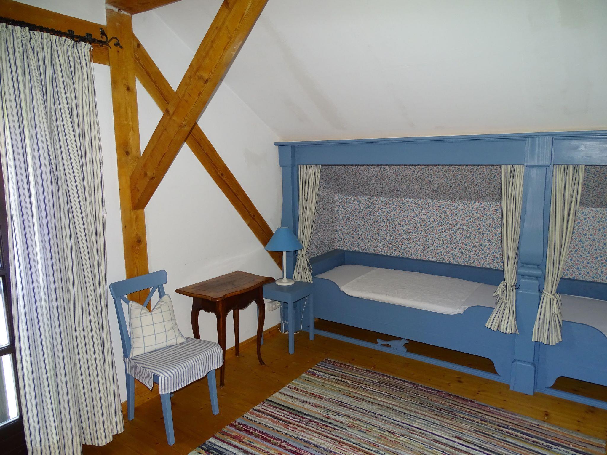 The holiday home Victoria is divided into two floors. On the ground floor is the large hallway, the guest WC and the large, rustic kitchen-cum-living room with a large tiled stove. The kitchen-living room has dark panelling, just as it used to look in Bavarian taverns. The kitchen has a kitchenette with cooker, dishwasher and fridge. The beautiful large tiled stove is heated from the hallway. The large, wide wooden staircase takes you to the upper floor. There you will find the bathroom with shower, WC and washbasin. In the first bedroom there is a living area with two sofas, writing facilities, a farmhouse wardrobe with TV and two bunk beds. In the second bedroom there is a large double bed and a seating area. All floors in the house are made of wood. There are spacious built-in wardrobes in the second bedroom and in the hallway.