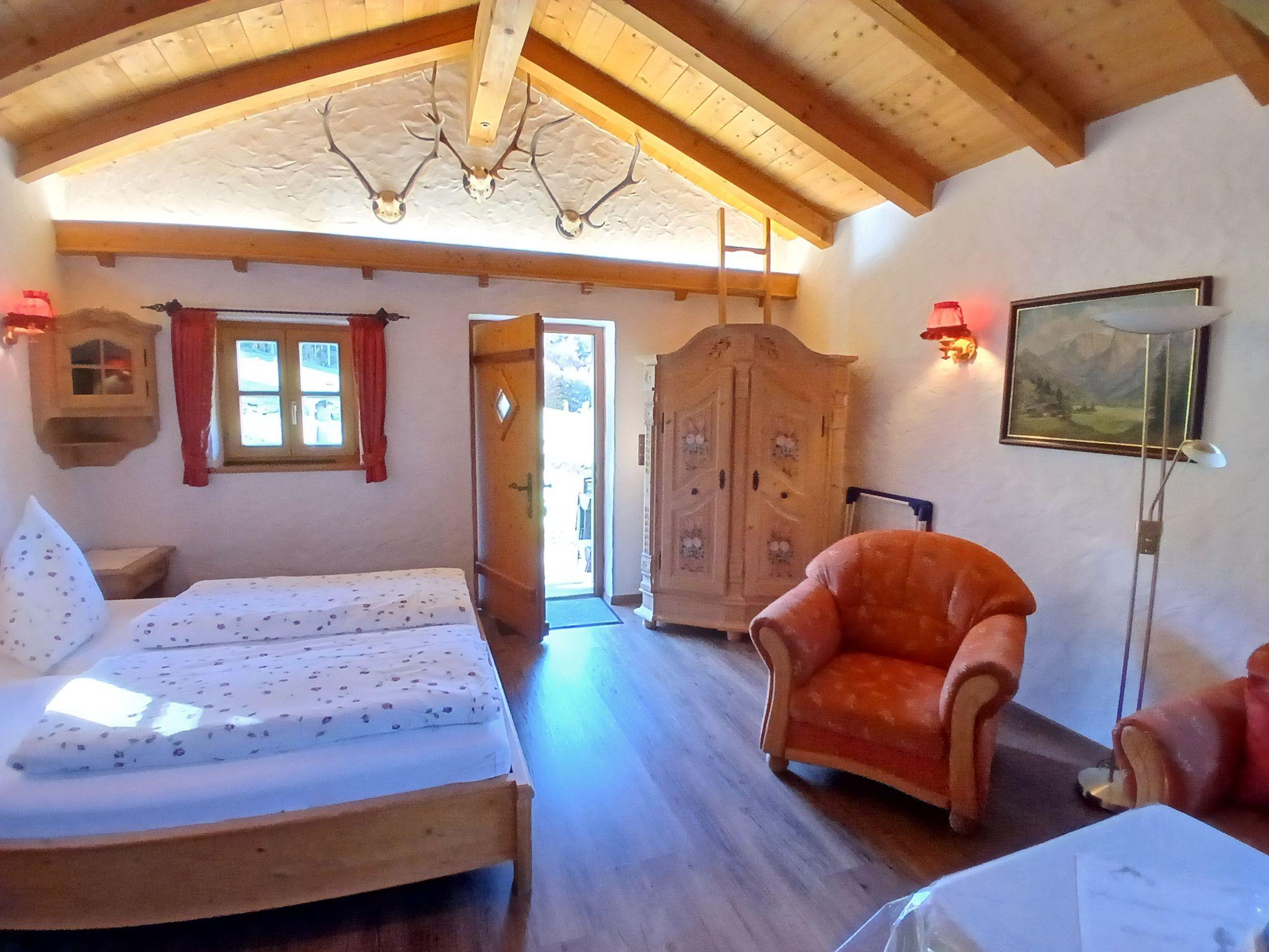 Appartment mit Altholz, 40qm, Doppelbett 1,80 x 2,00, eine Schlafcouch mit Lattenrost und Matratze ist in der Wohnküche vorhanden, Breite 1,60 Küche, Bad, Fön, Terasse mit Bergblick.