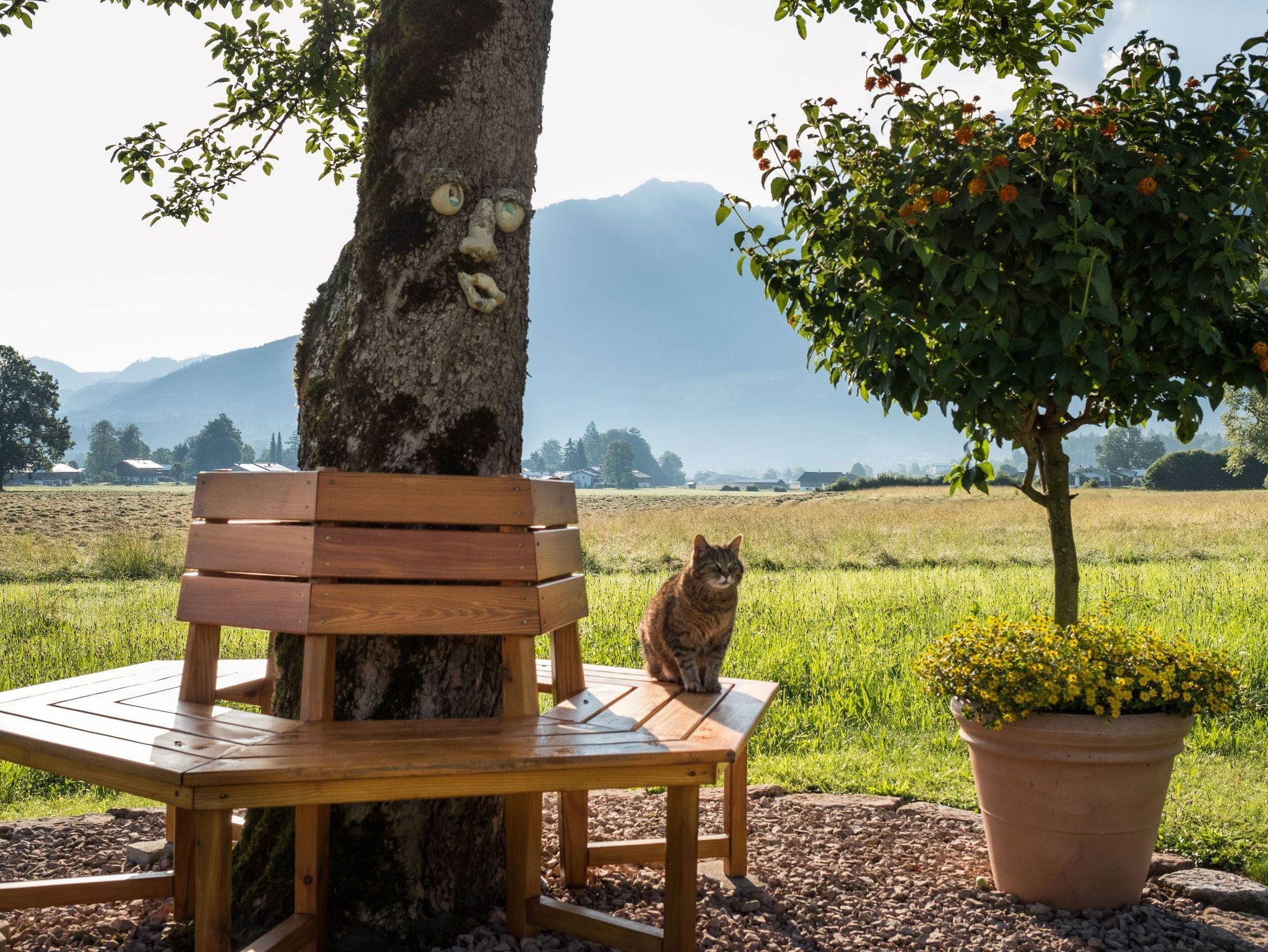 • Balkon übers Eck (möbliert): Ost- und Südseite, Terrasse, Rundumbank um unseren Apfelbaum, Schaukelbank, Sonnenliegen, Sitzgruppen