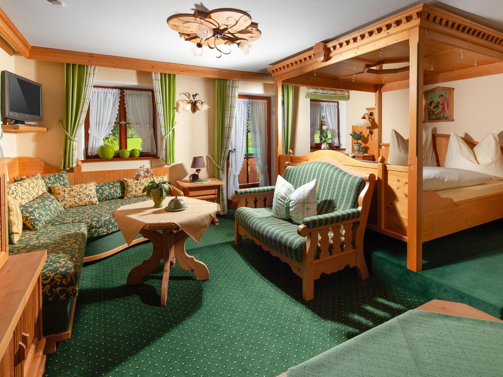 • Wohnraum - Schlafraum mit Himmelbett (Sternenhimmel), Kuscheleckcouch, zusätzliche Couch, gemütlicher Sessel, Flachbildschirm-Sat-TV, Radio-CD-Player, Garderobe mit Ganzkörperspiegel, Tresor für Ihre Wertsachen, Kleiderschrank, Sitzecke
