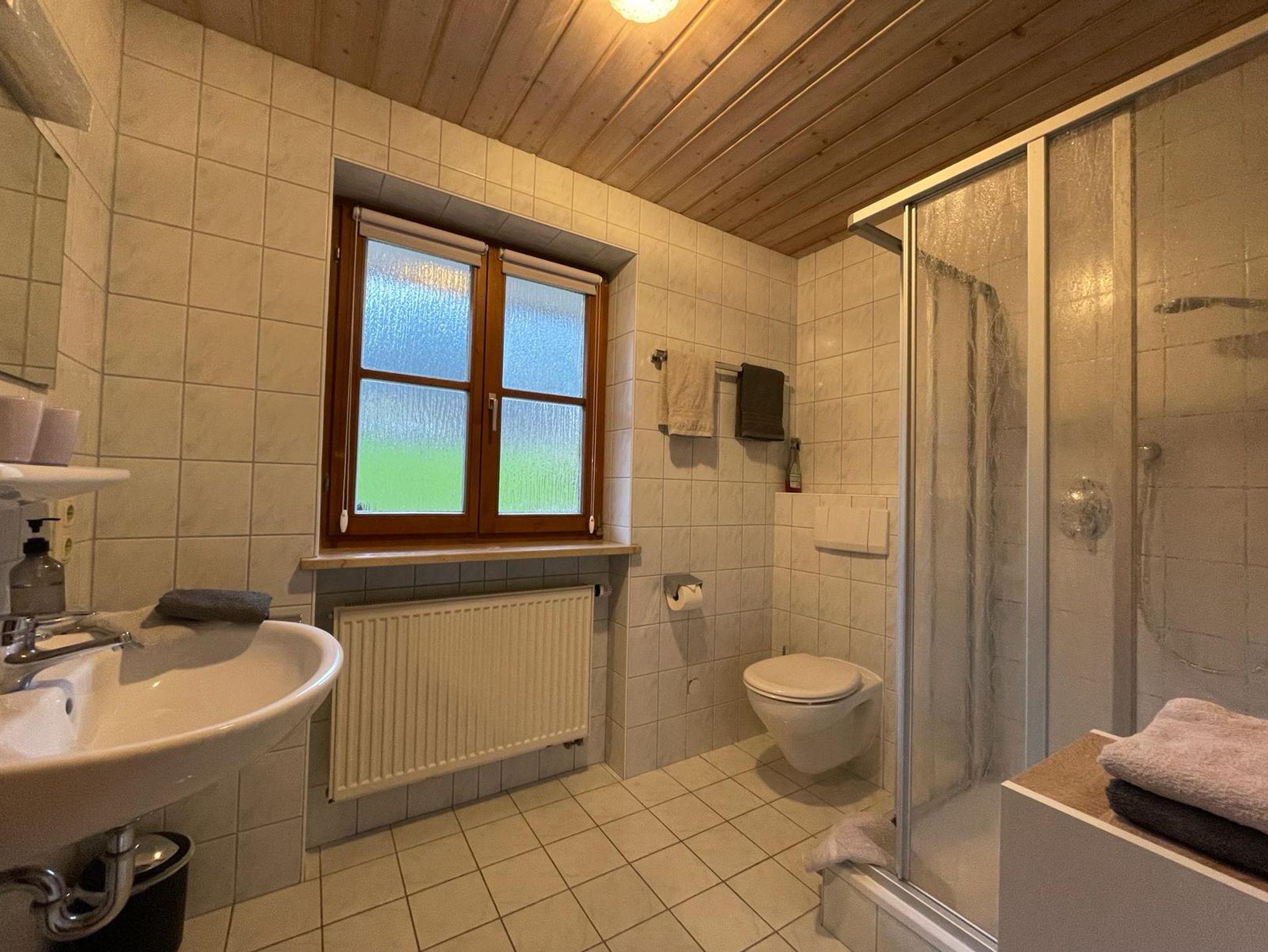 Die gemütlich eingerichtete Ferienwohnung liegt im 1. Stock und verfügt über ein separates Schlafzimmer (Bettwäsche vorhanden), eine gemütliche Wohnküche mit Sitzecke, ausziehbarer Couch, TV, 4-Platten-Herd, Backofen, Kühlschrank mit Gefrierfach, Kaffeemaschine, Wasserkocher. Im Bad mit Dusche/WC liegen für Sie Handtücher und Fön bereit. Auf dem möblierten Balkon genießen Sie die Ruhe und den Blick auf die umliegenden Berge. Unseren Gästen stellen wir kostenloses WLAN zur Verfügung.
