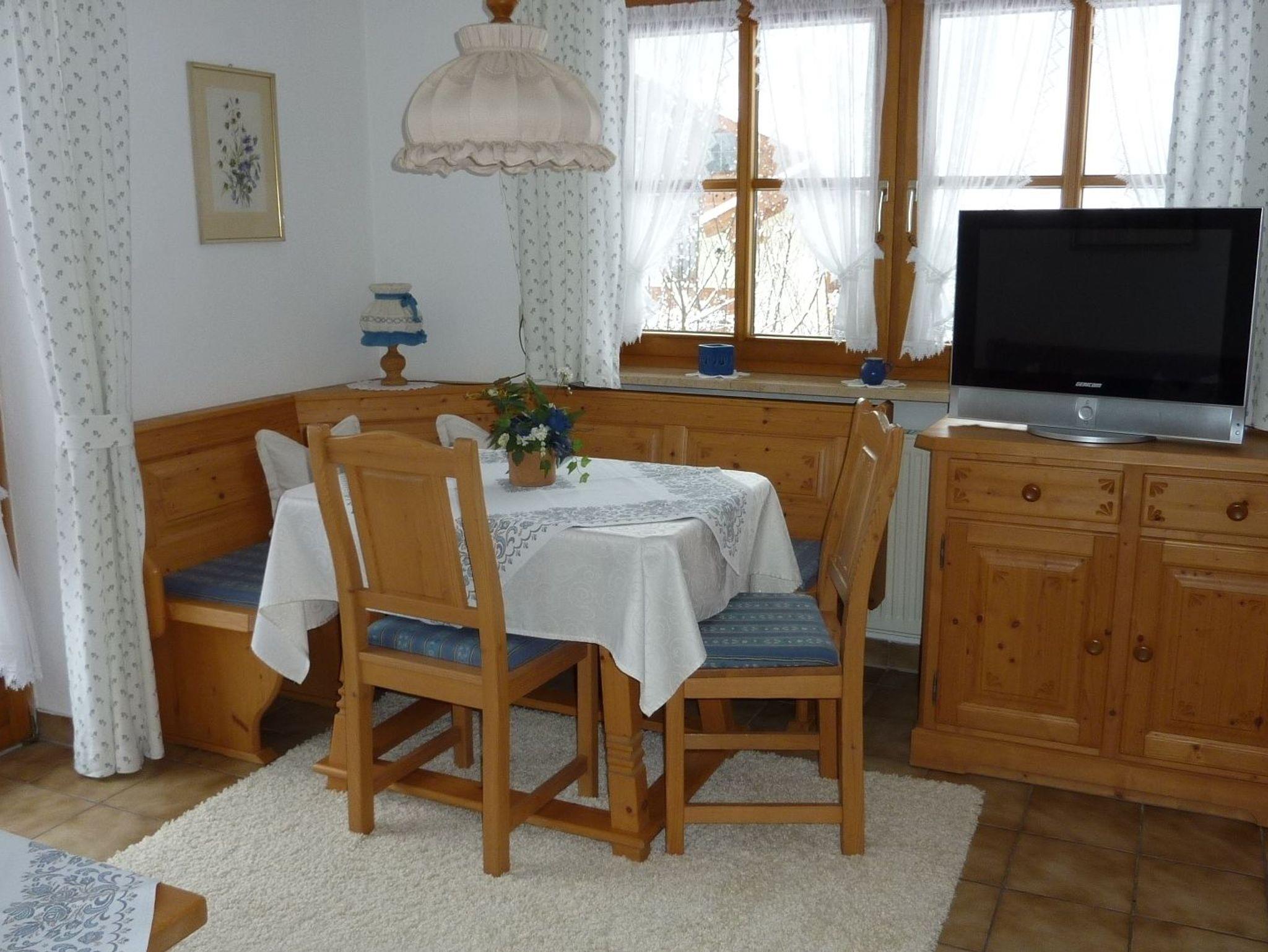 Unsere liebevoll eingerichtete Ferienwohnung „Enzian“ befindet sich in der 1. Etage und verfügt über 2 Balkone mit traumhaftem Bergblick. Der gemütliche Wohnbereich mit Kabel-TV hat u.a. eine gemütliche Essecke und eine neue Küchenzeile mit Geschirrspüler, Kühlschrank mit Gefrierfach usw., 1 separates Schlafzimmer mit Bandscheibenmatratzen, neues Bad mit ebenerdiger Dusche, Waschbecken und WC.Ausgestattet ist die Wohnung mit Bettwäsche, Handtücher, Geschirr, Kaffeemaschine, Mikrowelle, Wasser- und Eierkocher, Toaster, Bio-Teestation, Fön, Seifen- und Duschgelspender, Toilettenpapier, Kosmetiktücher.Autostellplatz.