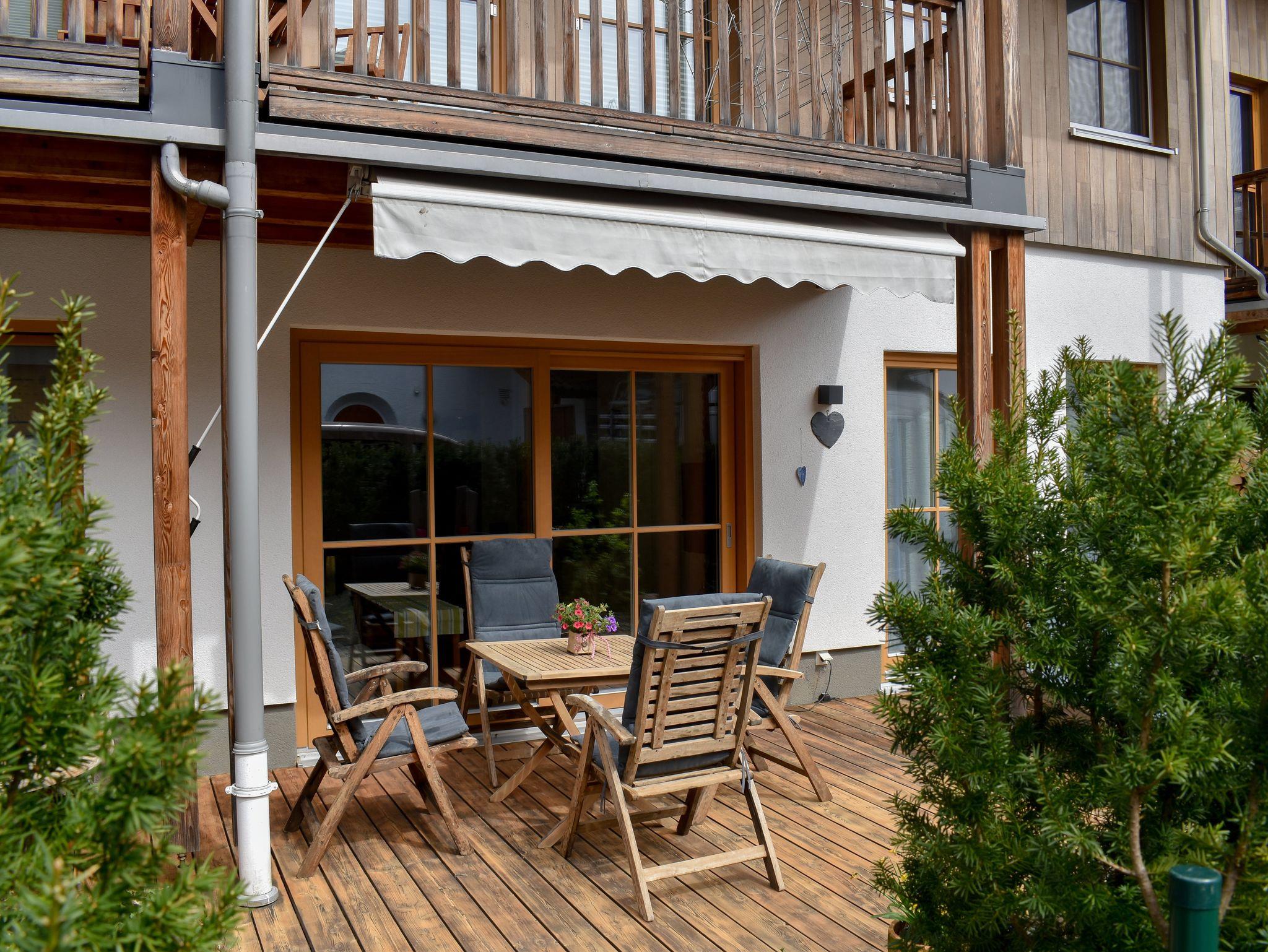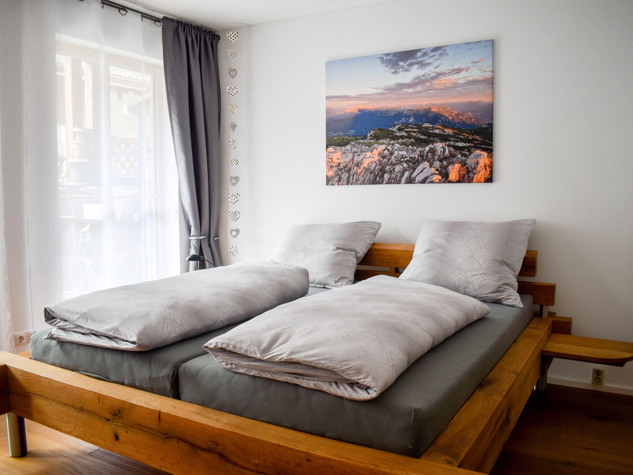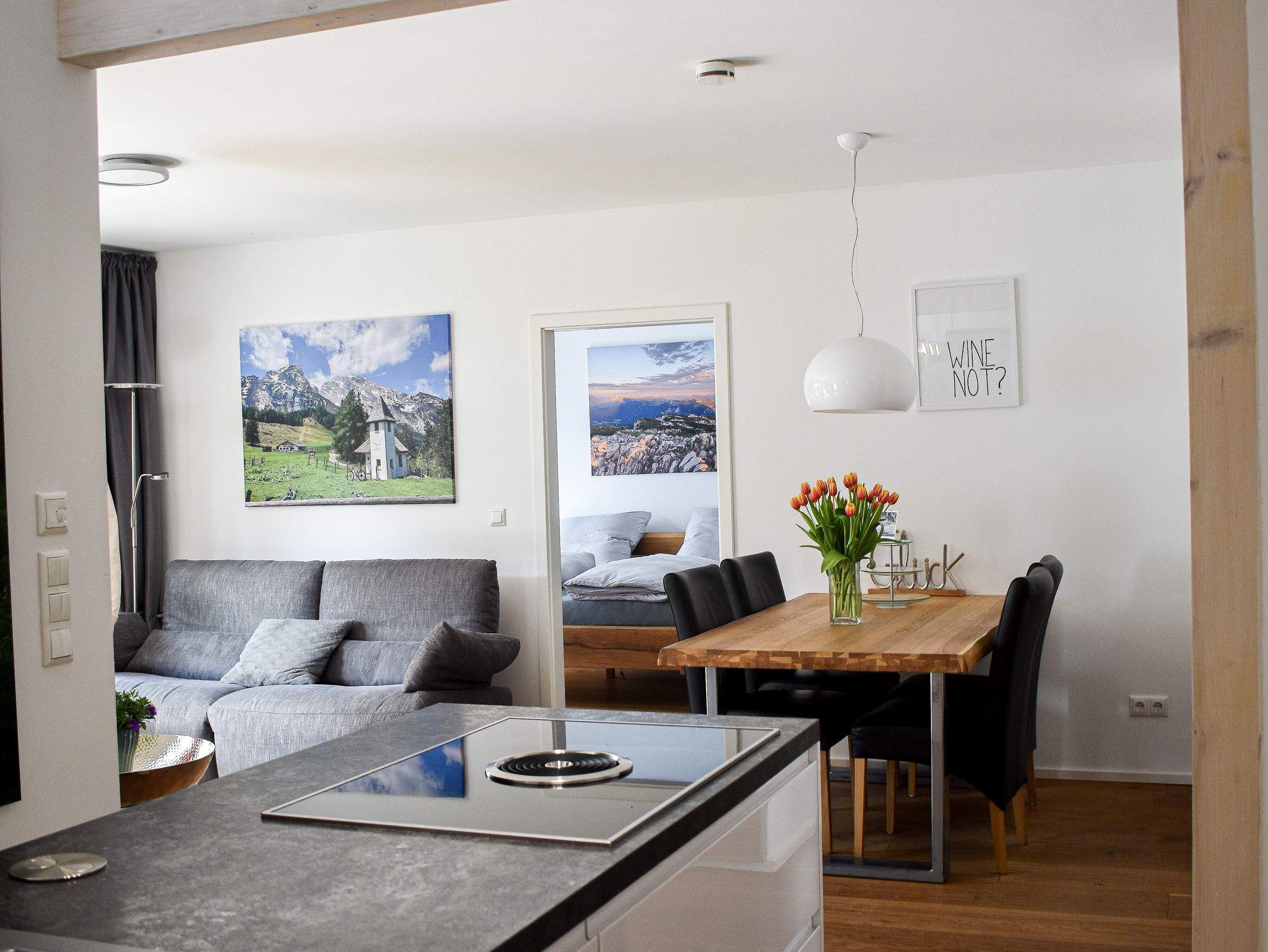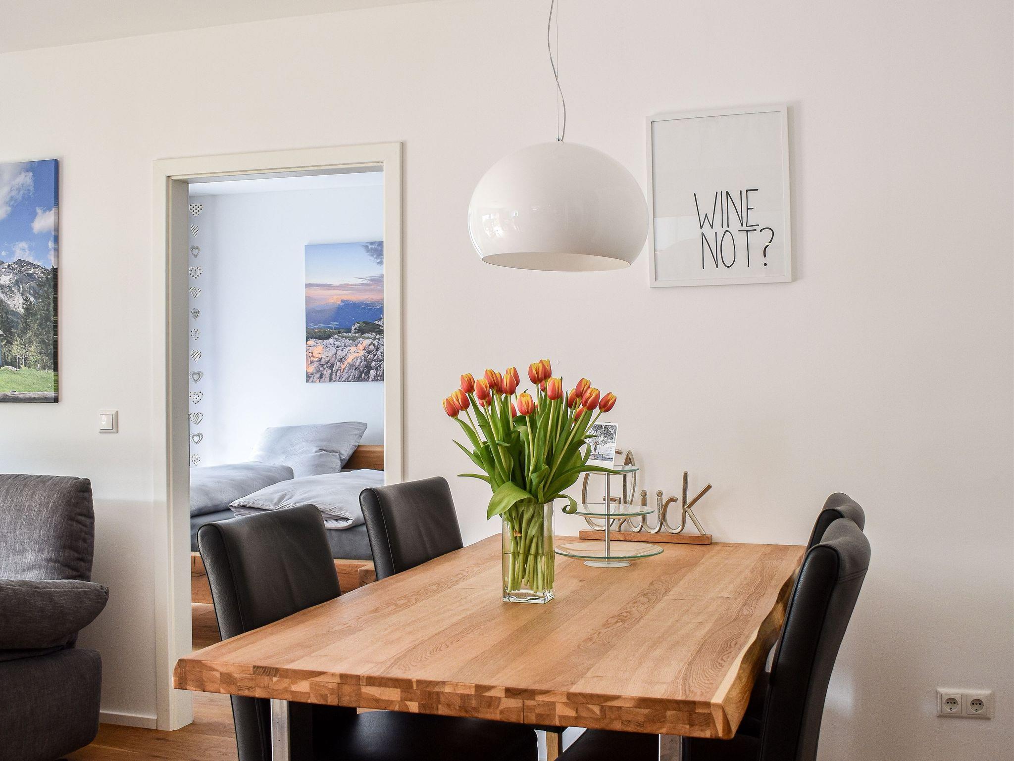 Die Wohnung beinhaltet einen großzügigen, offen gestalteten Wohn- Ess- und Kochbereich, 2 Schlafzimmer (1x mit Doppelbett und 1x mit 2 Einzelbetten) und 2 Bäder (einmal mit Dusche und Badewanne und einmal mit Dusche). Moderne TV Geräte finden Sie im Wohnzimmer und in einem Schlafzimmer. Die hochwertige Einrichtung der Wohnung lädt ein zum Entspannen. Alle Räume verfügen über Fußbodenheizung, die individuell regelbar ist; in den Wohnräumen können Sie den Komfort von Echtholzböden genießen. Sowohl von dem Wohnbereich als auch von beiden Schlafzimmern aus kann man auf die Terrasse gehen. Auf der 25m2 großen, möblierten, sonnigen und windgeschützten Holz Terrasse ist auch eine Grillmöglichkeit vorhanden. In dem kleinen blühenden Garten mit einem Zierbrunnen können Sie den Blick auf den Jenner genießen und die Seele baumeln lassen. Kinder sind bei uns herzlich willkommen!