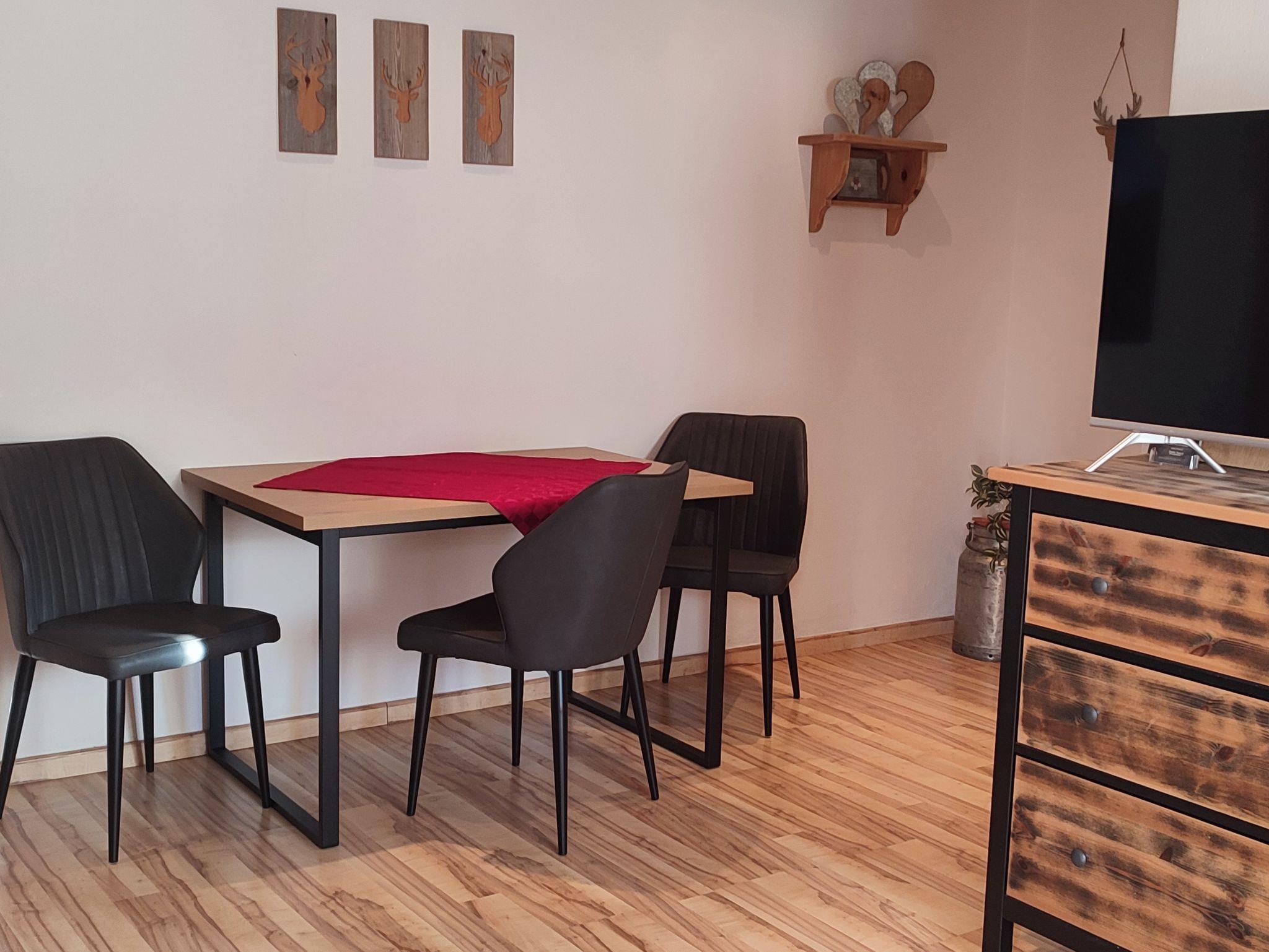Unsere im Erdgeschoss liegende Ferienwohnung mit separatem Eingang bietet Ihnen einen wunderschönen Bergblick von Ihrer Terrasse. Die Wohnung hat eine Wohnfläche von 55 m² und ist ideal für 2 Personen. Sie verfügt über eine komplett ausgestattete Küche mit Wasserkocher, Toaster und Kaffeemaschine sowie Sat-TV. Das Badezimmer ist mit Dusche und WC ausgestattet. Es gibt ein Schlafzimmer und einen großen Wohnraum mit Sofa. Ein Esstisch mit Stühlen steht Ihnen zur Verfügung. Die Terrasse bietet eine gemütliche Sitzgelegenheit, von der aus Sie die herrliche Berglandschaft genießen können.