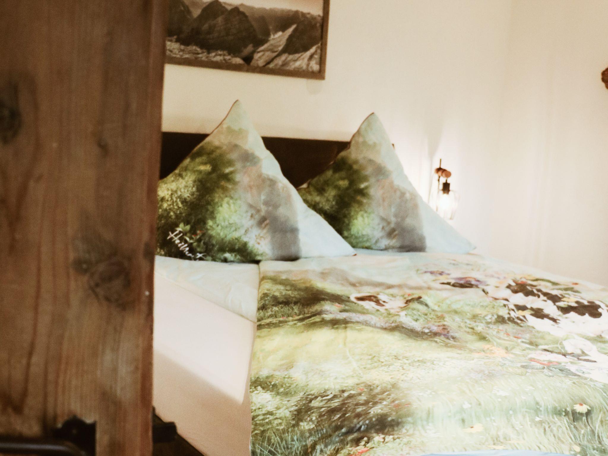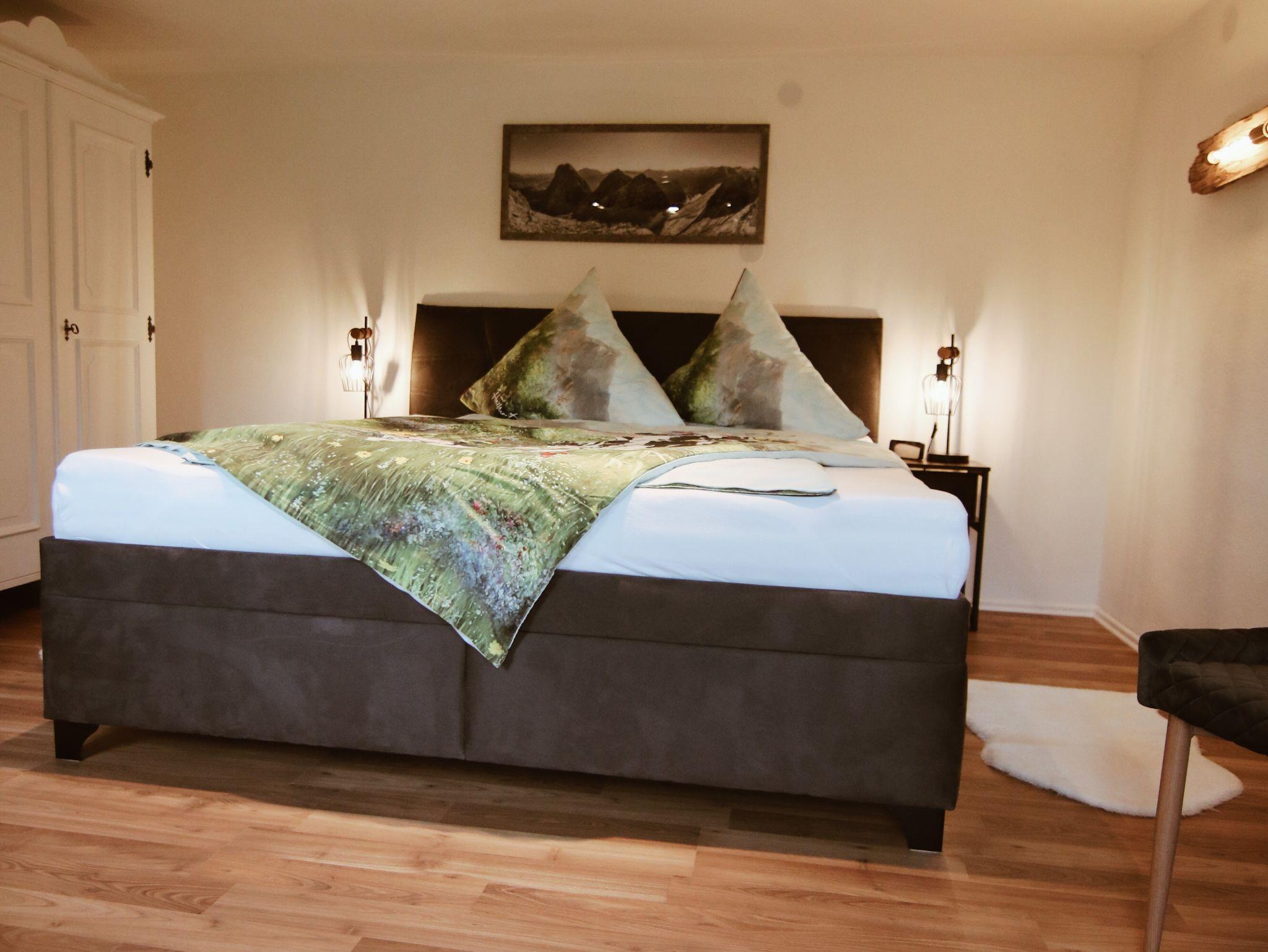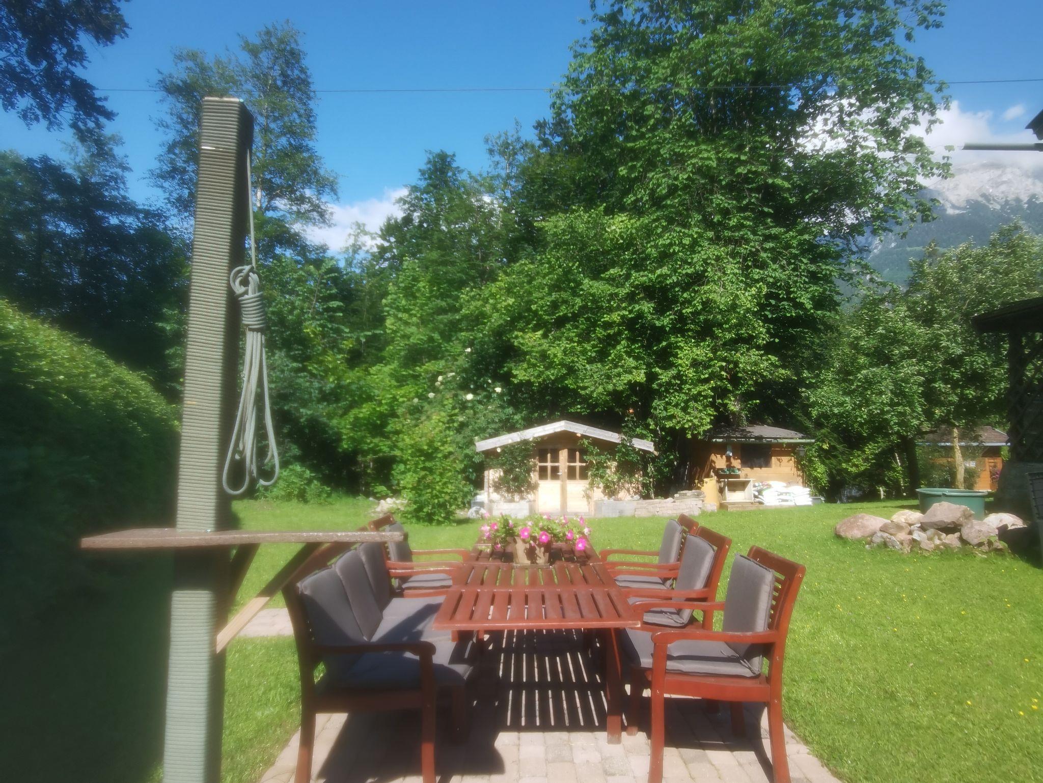 Die neu renovierte, modern ausgestattete Ferienwohnung verfügt über ein Wohn-Esszimmer mit Sat-TV, Radio, 2 Schlafzimmer mit je 1 Doppelbett 1,80m x 2,00m und einem großen Kleiderschrank, 1 Kinderzimmer mit 2 Einzelbetten je 0,90m x 2,00m und 2 Kommoden. Die vollausgestattete Küche bietet einen Elektroherd (4 Kochplatten und Backrohr), Kühl-und Gefrierschrank, Kaffeemaschine, Wasserkocher, Toaster und separater Sitzmöglichkeit. Ein Badezimmer mit Dusche und WC. Im Eingangsbereich befindet sich ein Kamin mit gemütlicher Sitzmöglichkeit. Der Nord-Ost-Südbalkon bietet einen traumhaften Alpenpanoramablick. Im Garten befindet sich eine eigene Terrasse mit großem Tisch, 6 Sitzplätzen und großem Sonnenschirm.