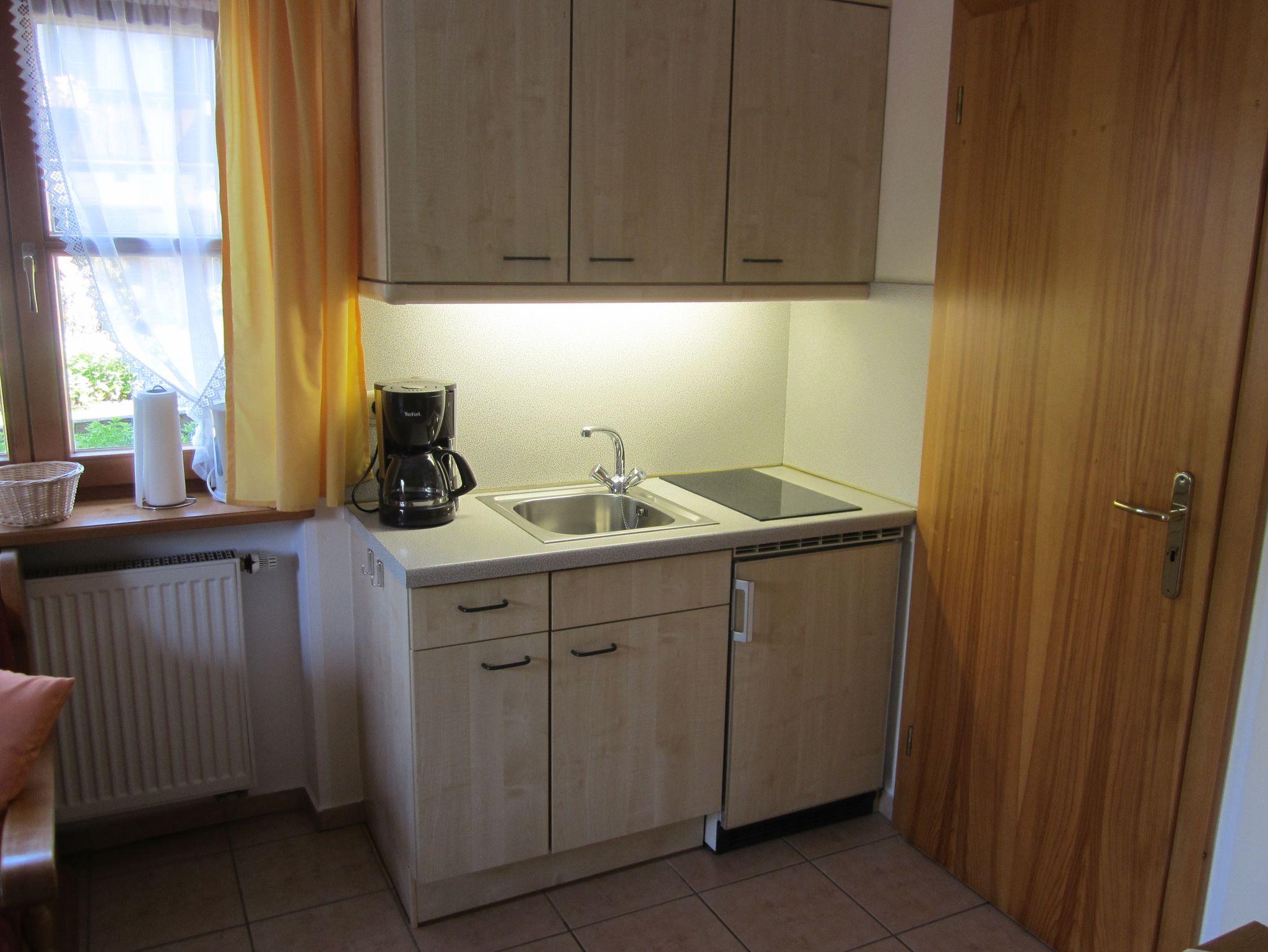 Ferienwohnung für 1-2 Erwachsene (44 m²) mit eigener Terrasse, Schlafzimmer, Dusche/WC, Wohnzimmer mit Küchenzeile, Eckbank mit Tisch und Sofa, Internet-TV, WLAN, Radio, 2er Ceranfeld, Kühlschrank, Mikrowelle, Wasserkocher, Eierkocher, Kaffeemaschine, Toaster. Eigener Eingang, Kfz-Stellplatz.