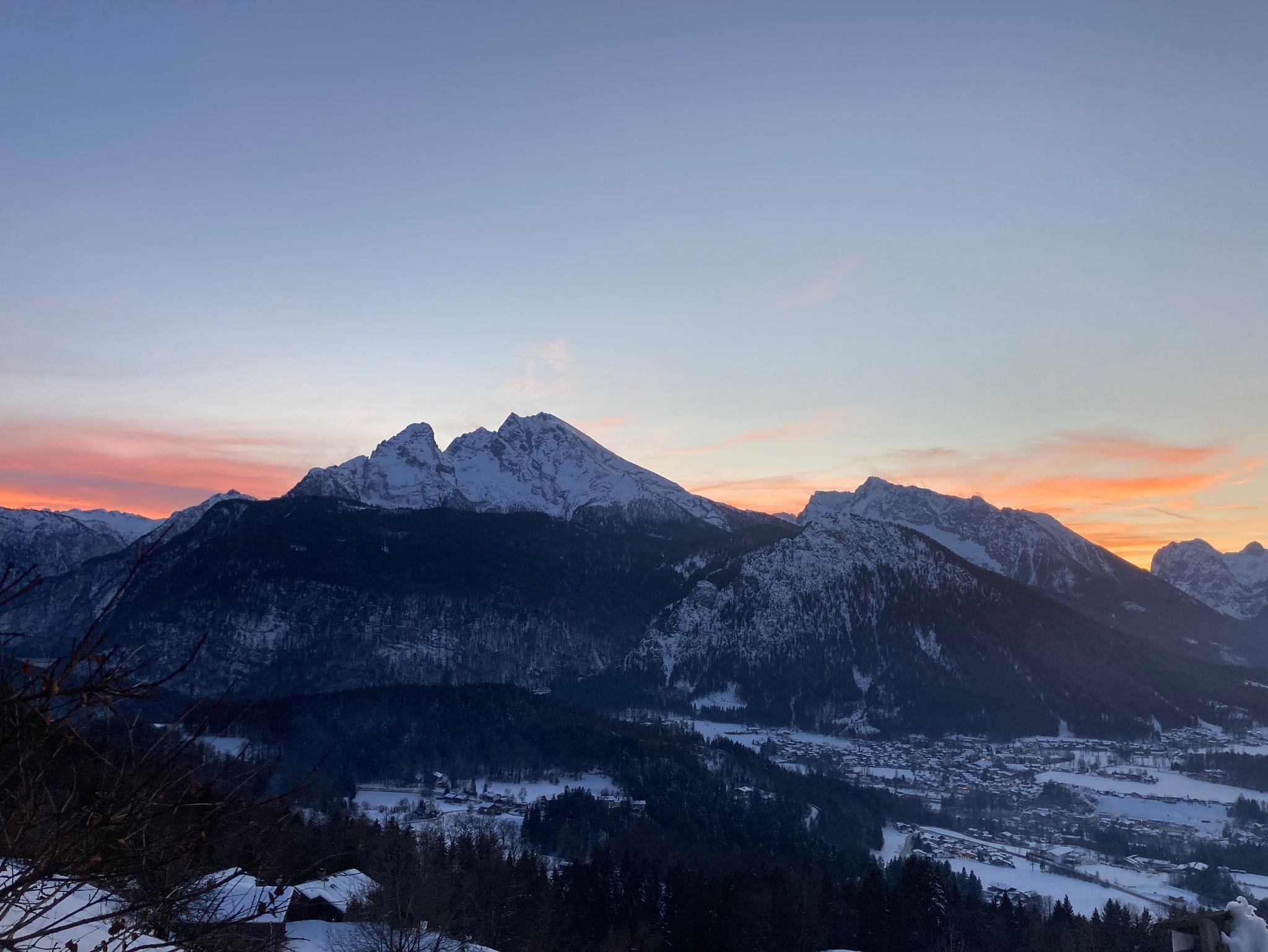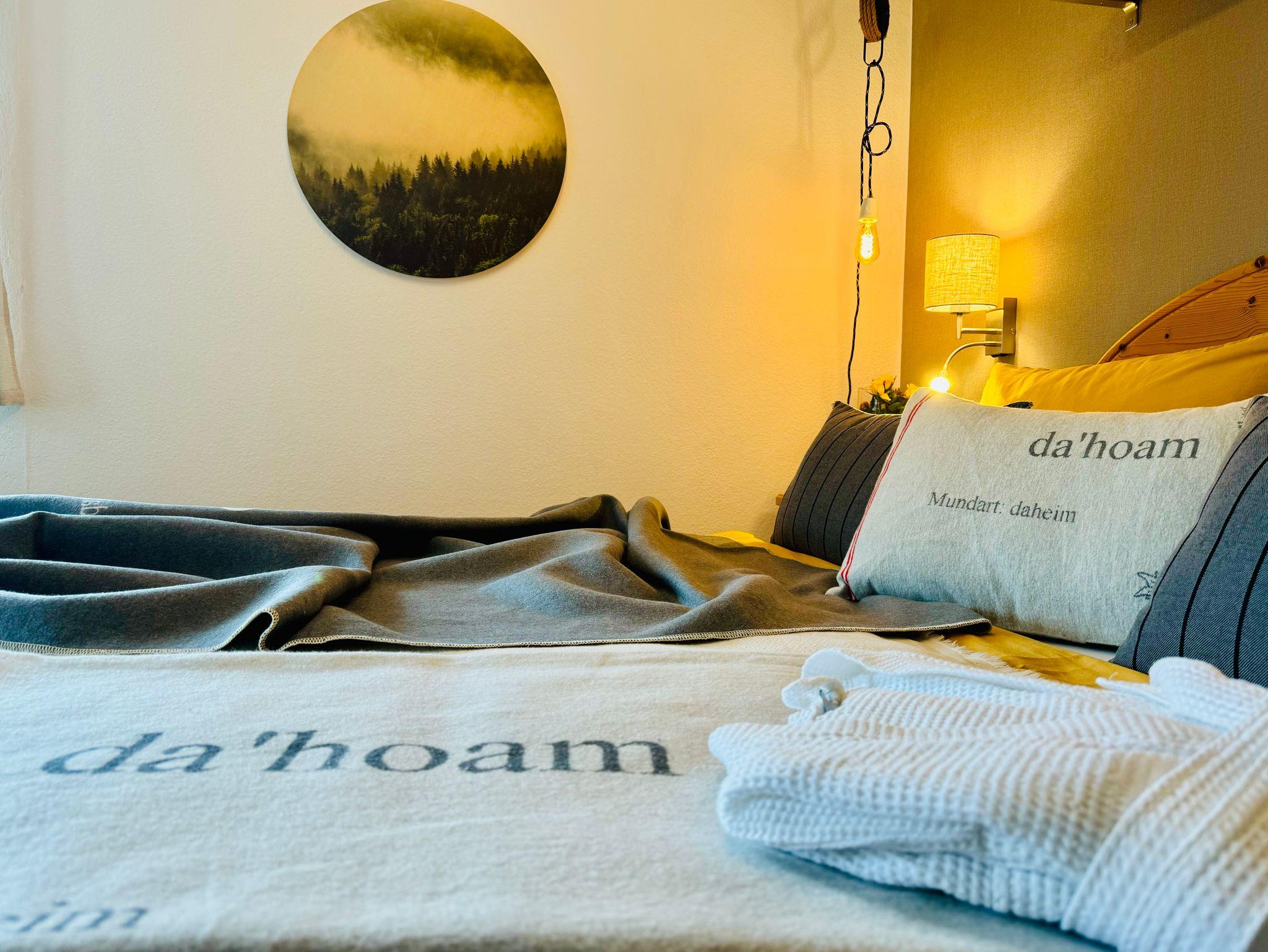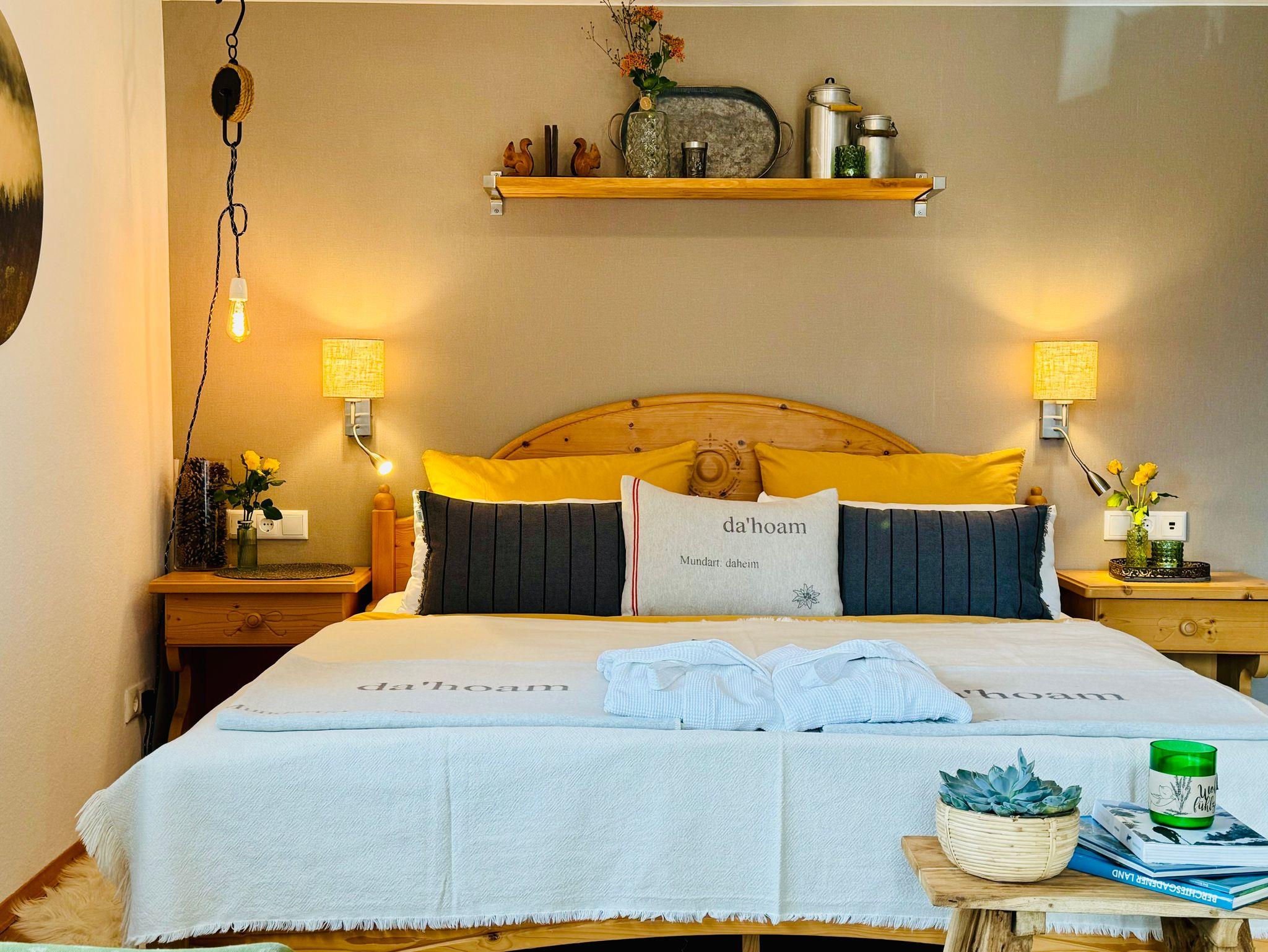 Das Herzstück unserer Ferienwohnung Dahoam ist der gemütliche Wohn–und Schlafbereich mit Doppelbett, Canapé, Kachelofen und mit Blick auf den Watzmann.