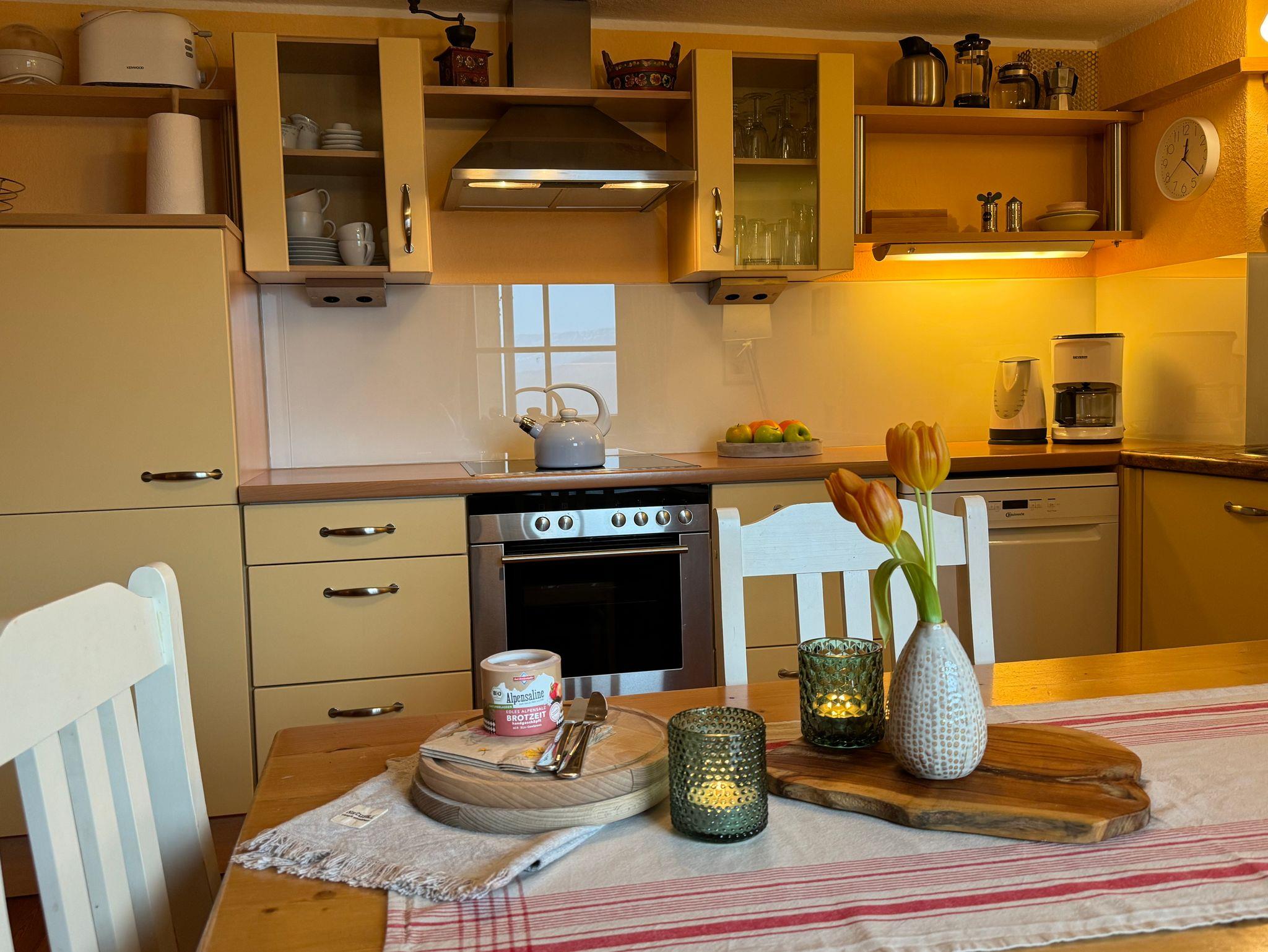 Küche – Vollausstattung. Esstisch mit Küchenbank, Küchenzeile, rundes Spülbecken mit Marmoreinfassung, Küchenutensilien, Kaffeemaschine, Espressomaschine, Teeauswahl, Wasserkocher, Taster, Eierkocher, Brotzeitbrett, Kühl– Gefrierkombination... es ist alles da!