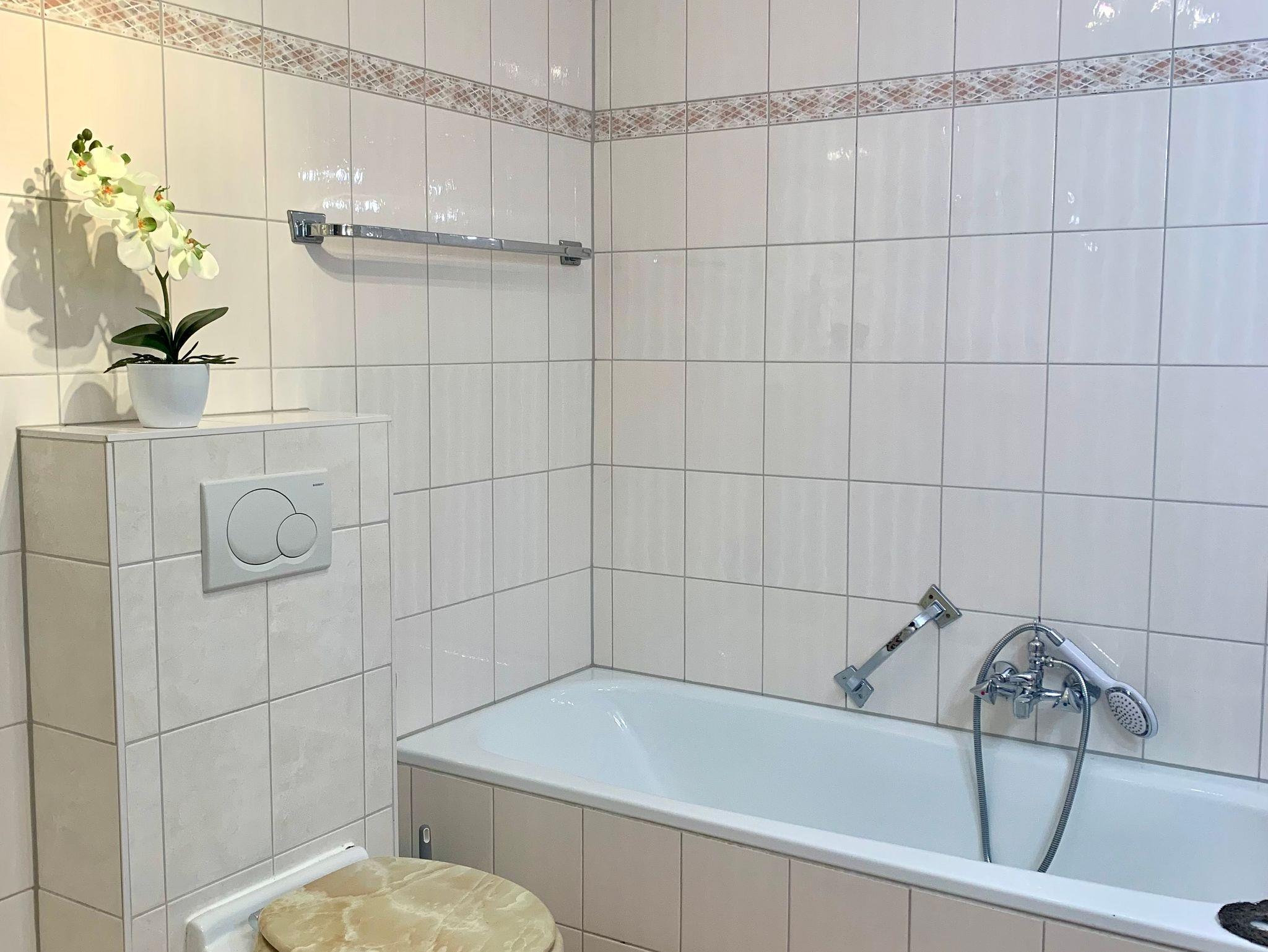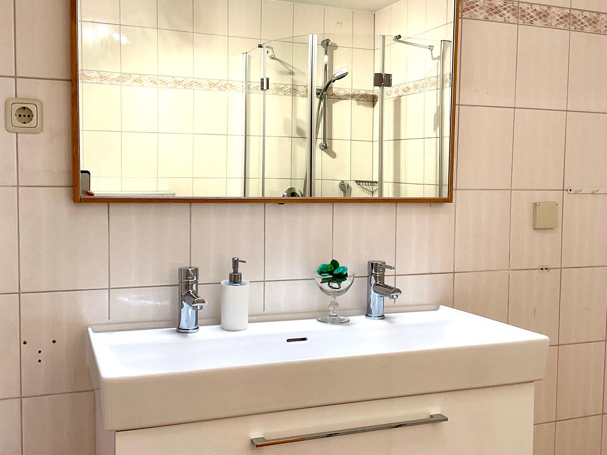 Modernes Bad mit großem Waschtisch (2 Wasserhähne), Dusche und zusätzlicher Badewanne.