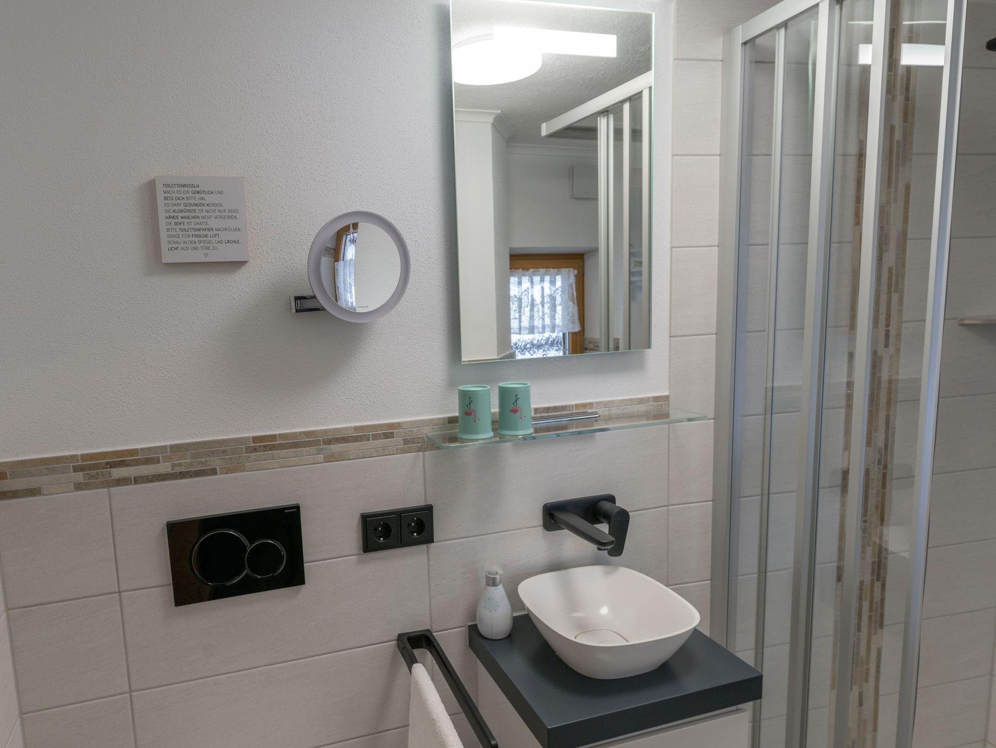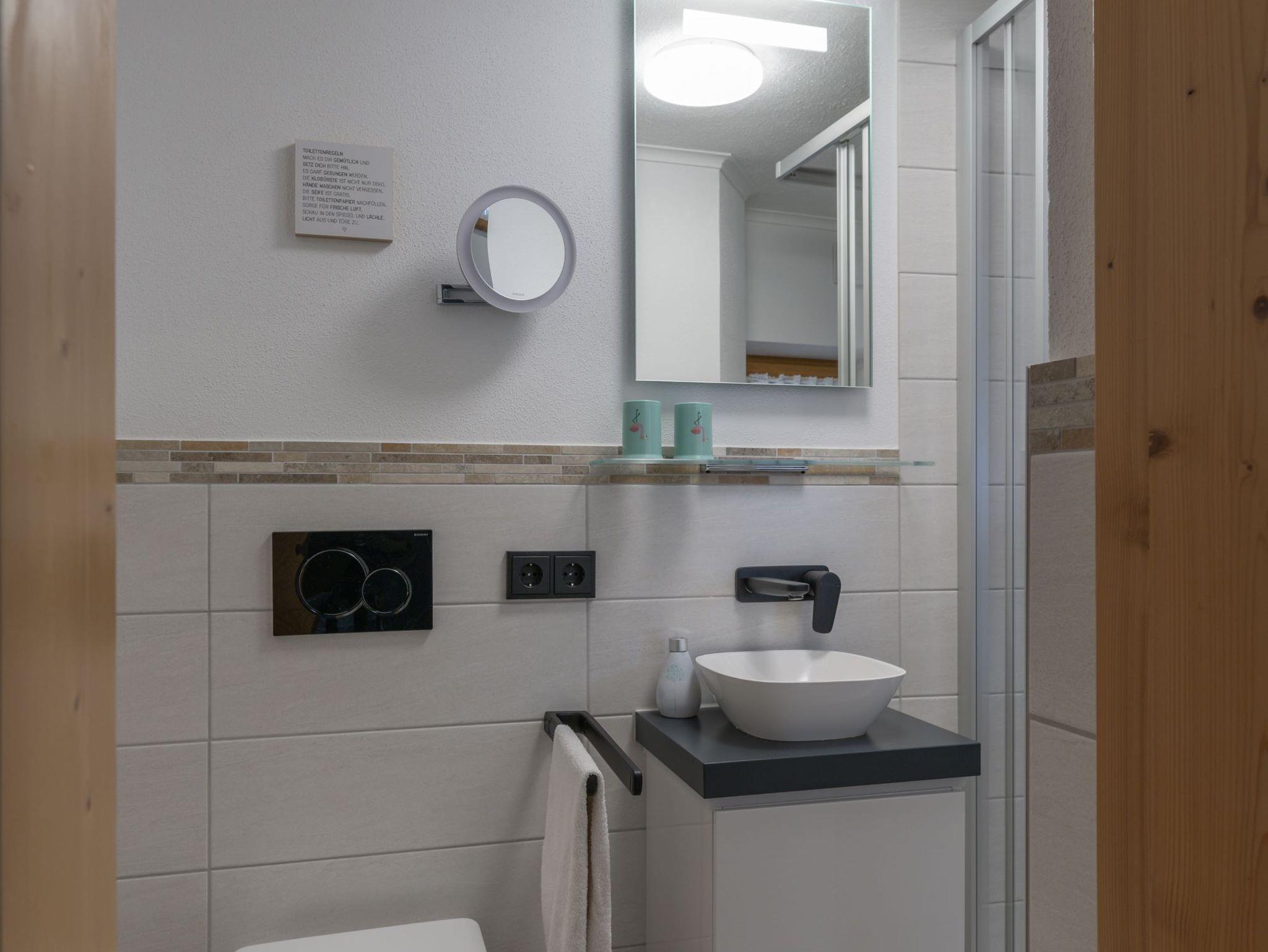 Die Wohnung verfügt auch über ein modernes Badezimmer mit Regendusche und WC. Es gibt auch einen Balkon, von dem aus man die schöne Aussicht genießen kann.