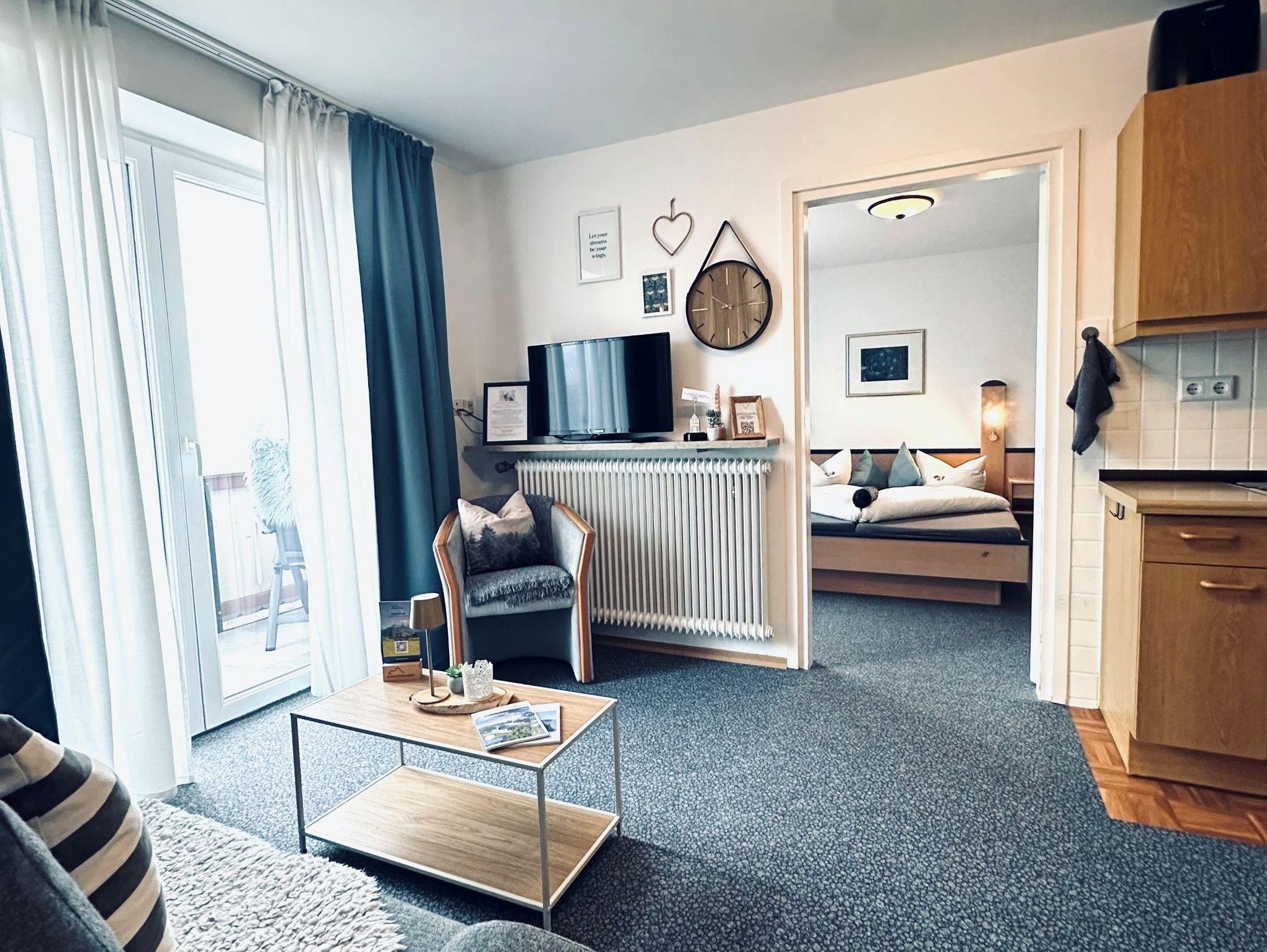 Die Ferienwohnung liegt im 1. Stock und bietet Platz auf 50 qm. Sie verfügt über ein separates Schlafzimmer, einen Wohn- Schlafraum mit Küchenzeile (2-Plattenherd, Kühlschrank, Tiefkühlfach, Kaffeemaschine, Wasserkocher uvm.), Essecke, Sitzgruppe, TV, WLAN und Zimmersafe sowie ein Bad mit Dusche/WC, Fön und Handtüchern. Auf dem möblierten Balkon geniessen Sie einen herrlichen Blick auf die Berge.