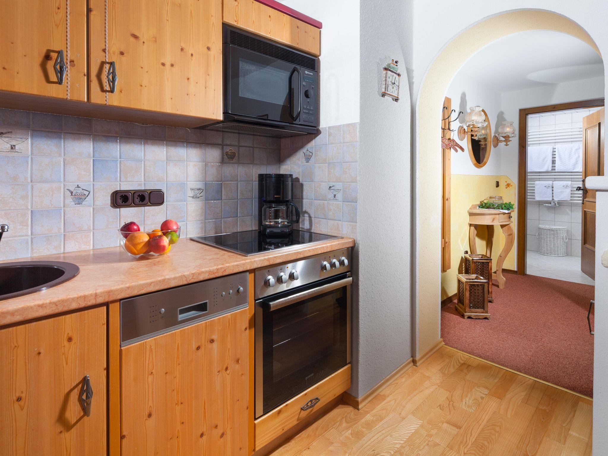 • Küchenbereich mit Essecke, Mikrowelle, Geschirrspüler, 4-Platten-Ceranherd, Backofen, Dunstabzug, Kühlschrank mit Gefrierfach, Kaffeemaschine, Wasserkocher, Eierkocher, Toaster, Geschirr farblich passend zur Ferienwohnung, Töpfe, Pfanne, Tablett, Brotzeitbretter