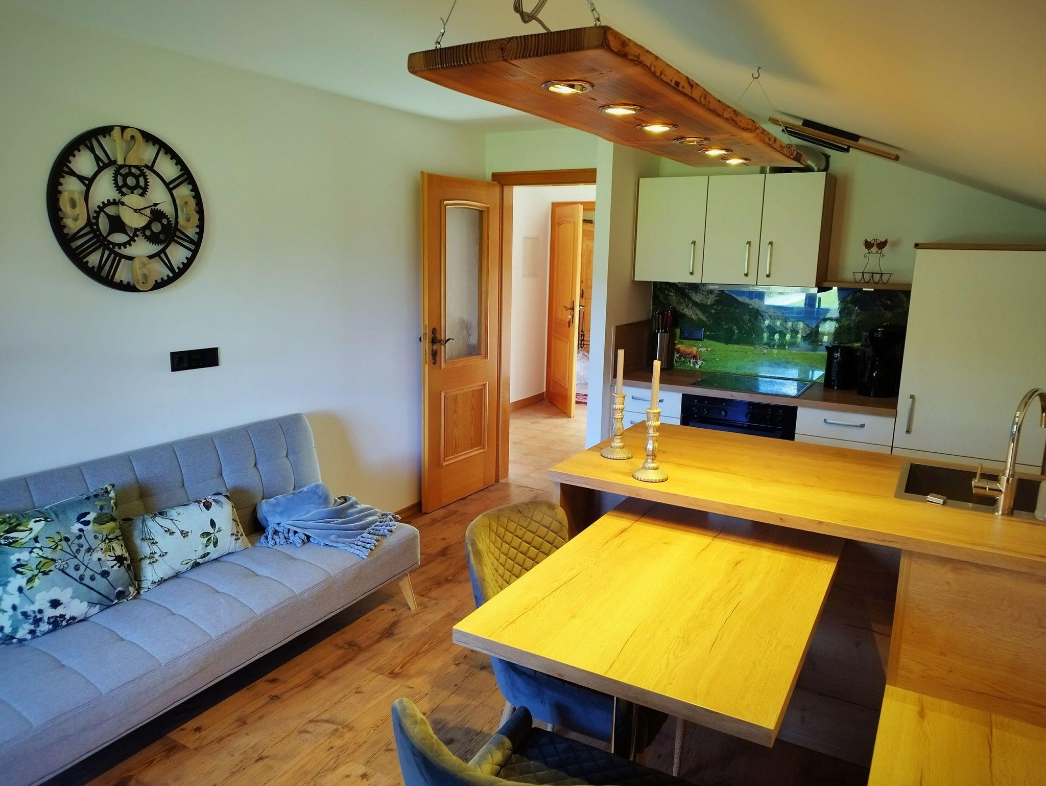 Sie enthält eine stilvoll und gemütlich eingerichtete Wohnküche mit vielen Extra`s einem großen Falchbild TV sowie einem Schlafsofa mit Zugang zum Balkon (mit Bergblick, Sitzgelegenheit und Sonnenschirm).