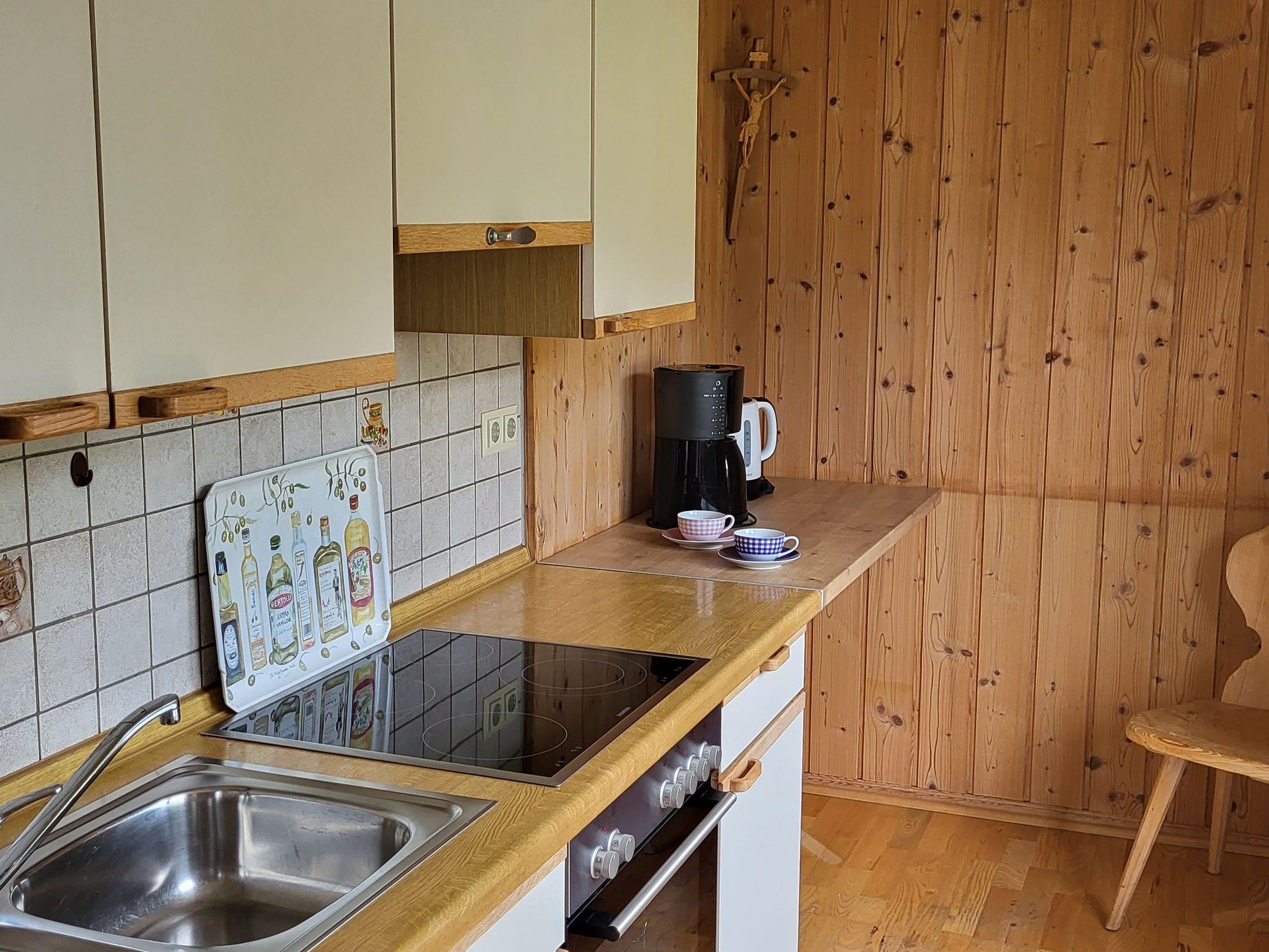 Unsere Nichtraucher-Ferienwohnung liegt im Obergeschoß und bietet auf 50 qm Platz. Sie ist ausgestattet mit einem separatem Schlafzimmer mit Doppelbett, einer Küche (Herd, Backofen, Kühlschrank), einem Wohnzimmer mit einer gemütlichen Sitzgruppe, TV, einem Bad mit Dusche/WC wo Fön und Handtücher bereitgestellt sind. Auf dem möblierten Balkon genießen Sie die Aussicht auf das herrliche Gebirgspanorama.