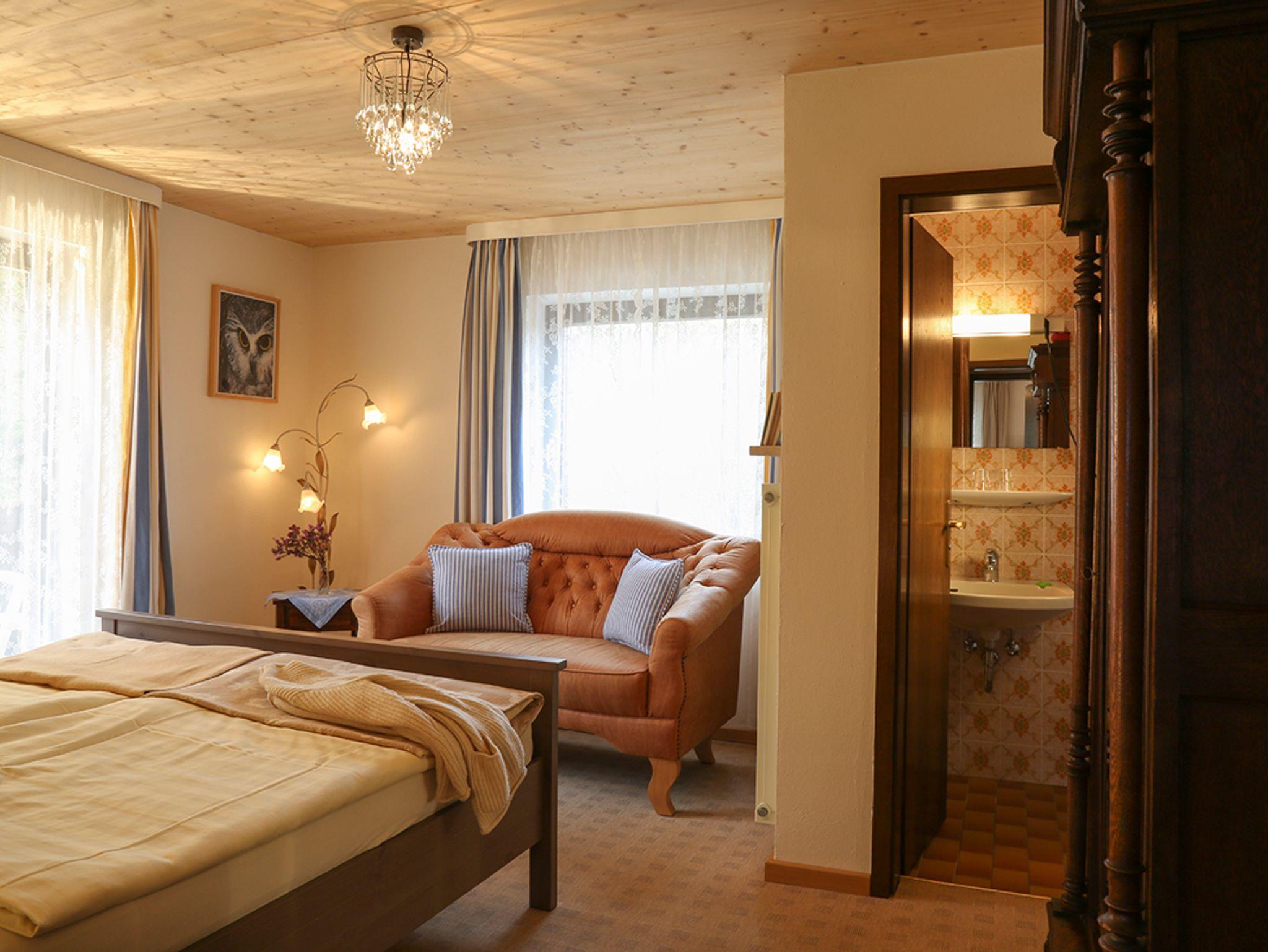 Das in einem Mix aus antiken und modernen Möbeln eingerichtete Doppelzimmer mit Dusche/WC wird durch eine bequeme Couch besonders gemütlich. Vom Balkon aus blickt man in Richtung Watzmann & Königssee.