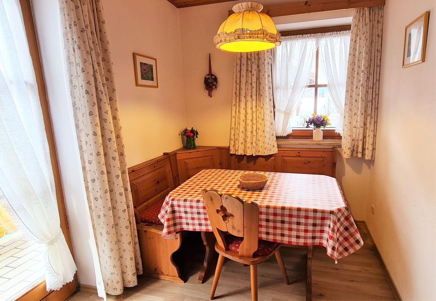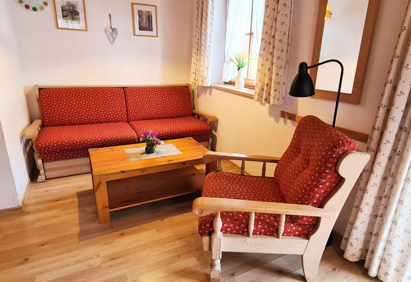 Die gemütliche kleine Wohnung im ersten Obergeschoss verfügt über eine kleine Küchenzeile, eine gemütliche Essecke mit uriger Eckbank, eine gemütliche Sitzecke und ein separates Schlafzimmer. Vom sonnigen möblierten Balkon genießen Sie das herrliche Bergpanorama.