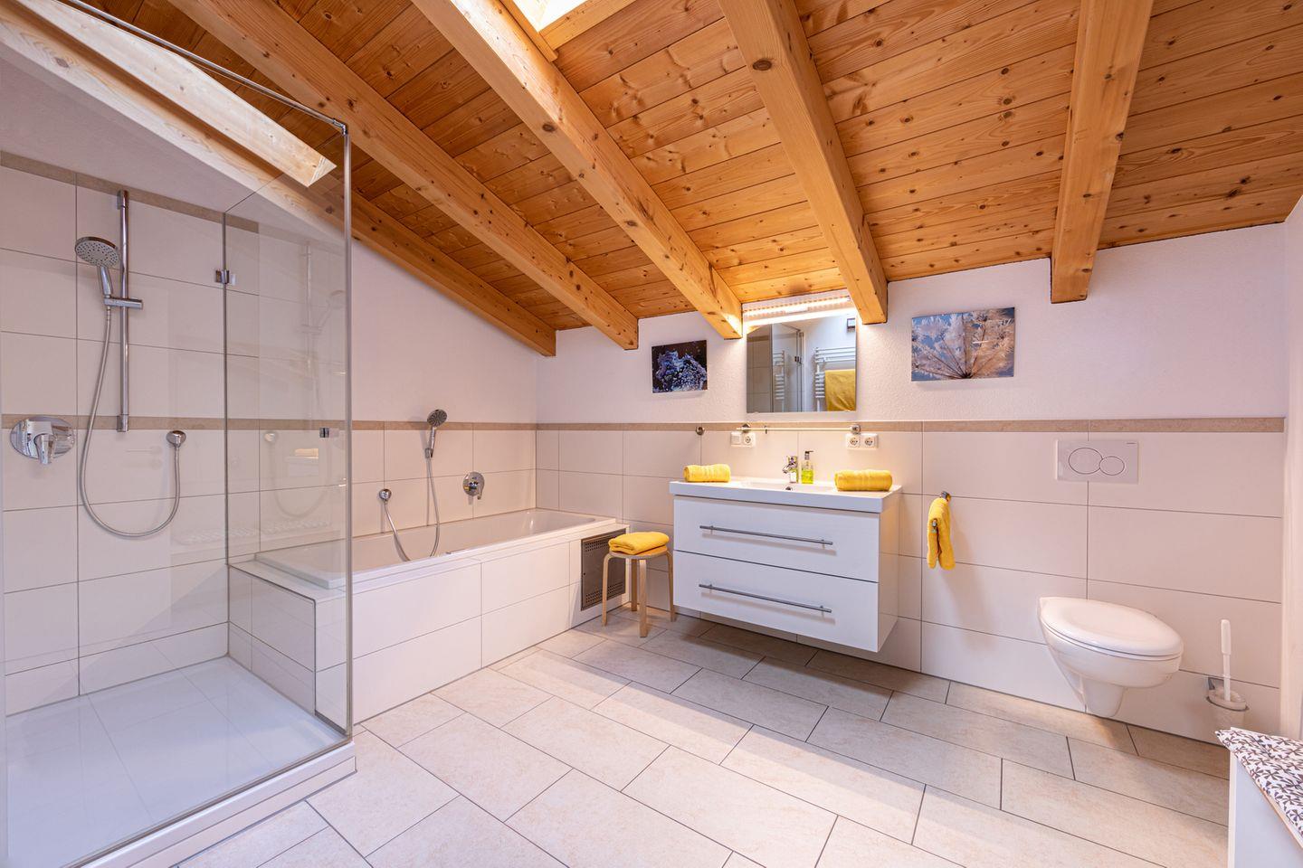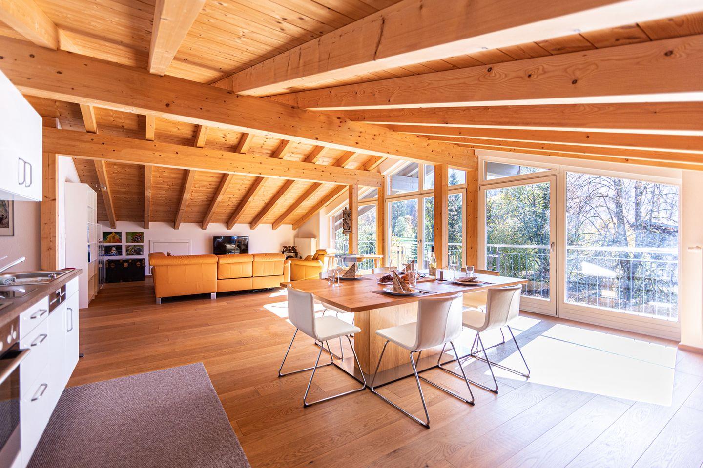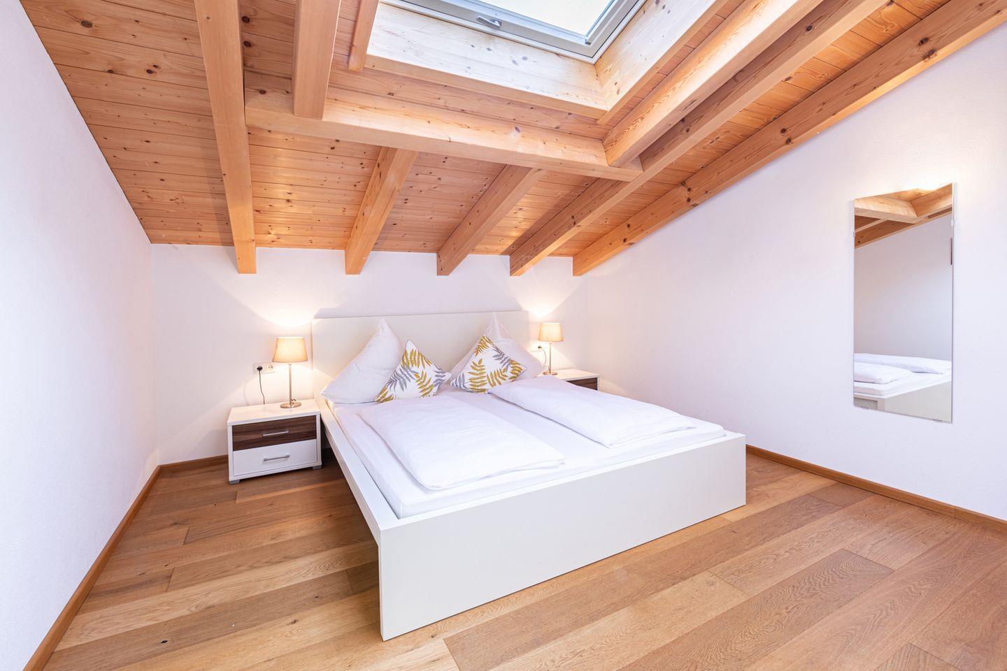 Die Fewo mit Panoramafenster zum Öffnen bietet einen herrlichen Bergblick (Südseite). Es gibt zwei getrennte Schlafzimmer mit jeweils einem Doppelbett und Kleiderschrank. Der Wohn- und Essbereich mit Küche und gemütlichen Sitzmöglichkeiten mit TV lädt zum Verweilen ein. Bad mit Whirlwanne und Dusche, WC und separates WC mit Waschmaschine. WLAN kostenfrei.