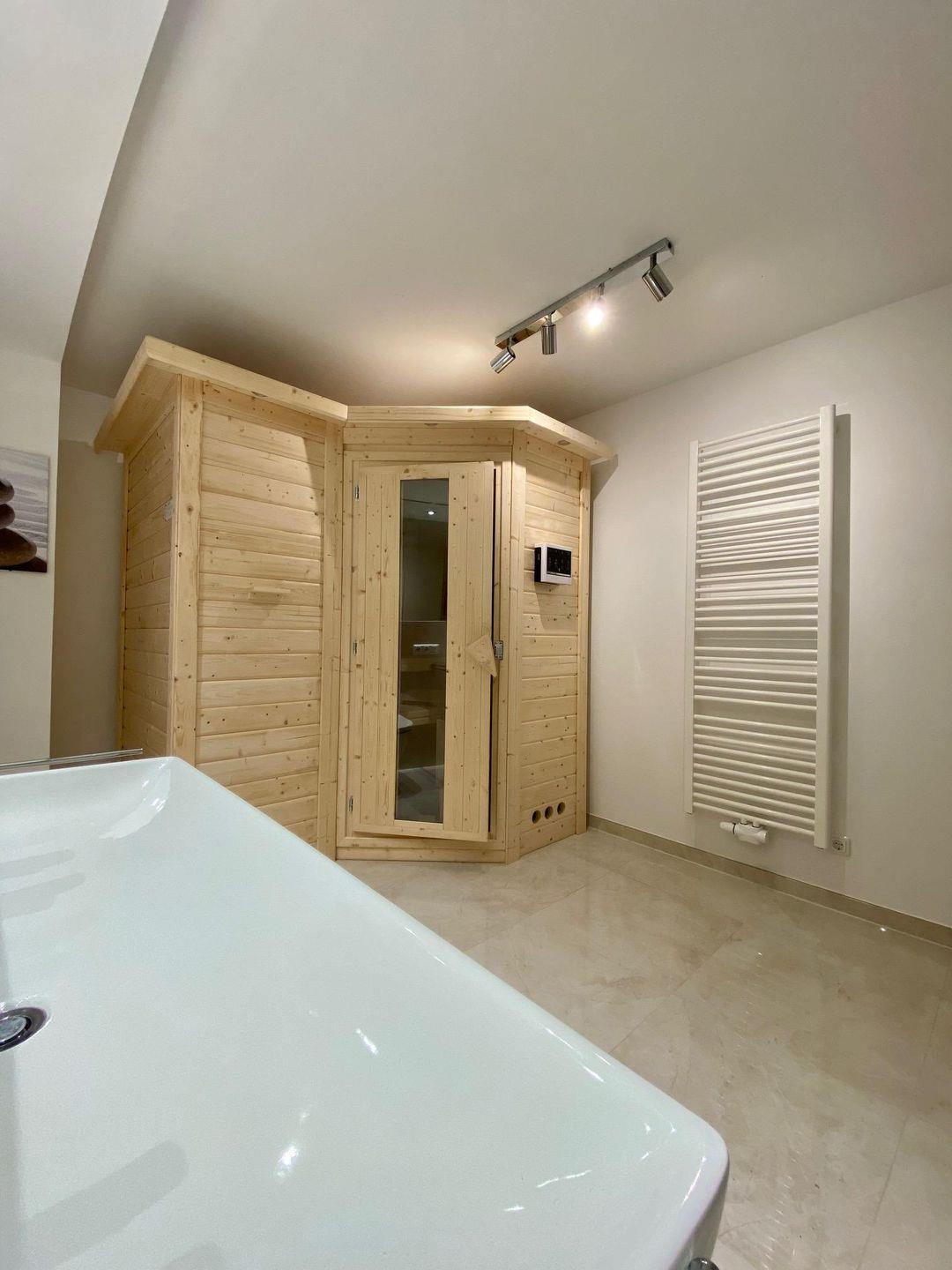 Im Untergeschoss befindet sich ein weiteres Schlafzimmer sowie ein modernes Bad mit Sauna und Doppelwaschtisch – ein privater Wellnessbereich ganz für Sie allein. Ein Waschraum mit Waschmaschine und Wäscheleinen steht ebenfalls zur Verfügung.