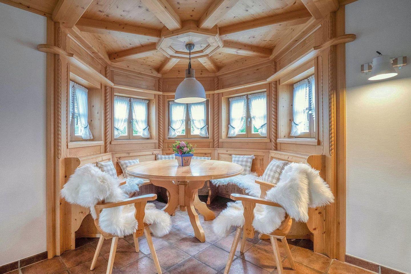 Im Erdgeschoss erwartet Sie ein großzügiges Wohnzimmer mit behaglichen Sitzbereichen, Flachbildfernseher, Stereoanlage und einer traditionellen Sitzecke am gemütlichen Elektrokachelofen – der perfekte Ort für entspannte Abende. Die angrenzende, voll ausgestattete Küche lädt zu gemeinsamen Kochmomenten ein – ob rustikales Abendessen oder ausgedehntes Sonntagsfrühstück.