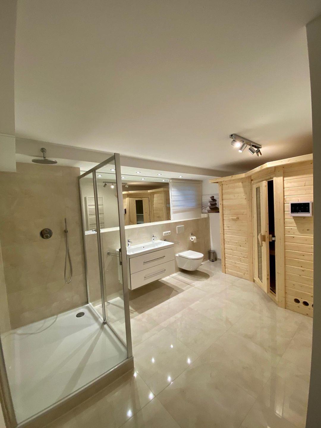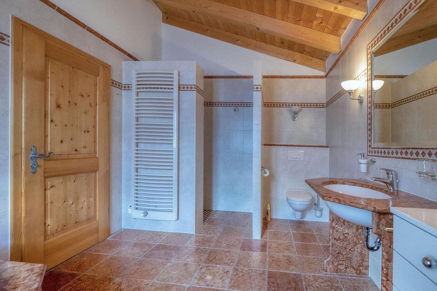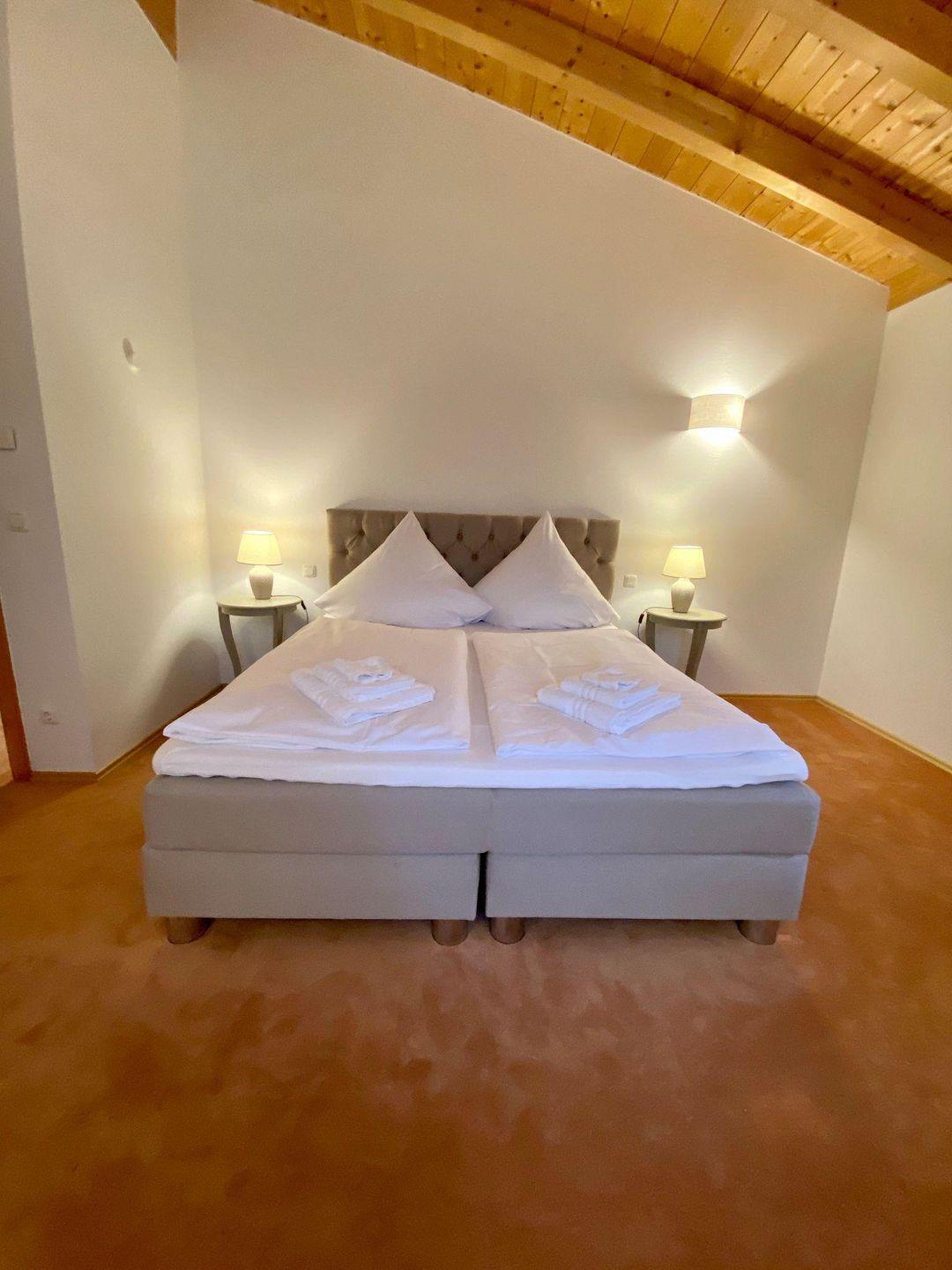 Das Obergeschoss beherbergt zwei stilvolle Schlafzimmer mit hochwertigen Boxspringbetten, eines davon mit ausziehbarem Schlafsofa und jeweils eigenem Bad. Eines der Bäder ist mit einer Badewanne ausgestattet – ideal zum Entspannen nach einem Tag in den Bergen.