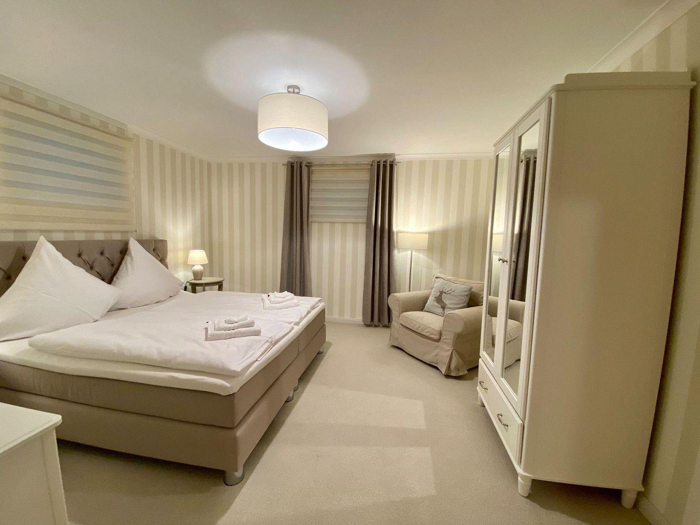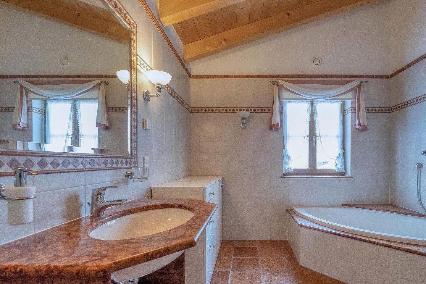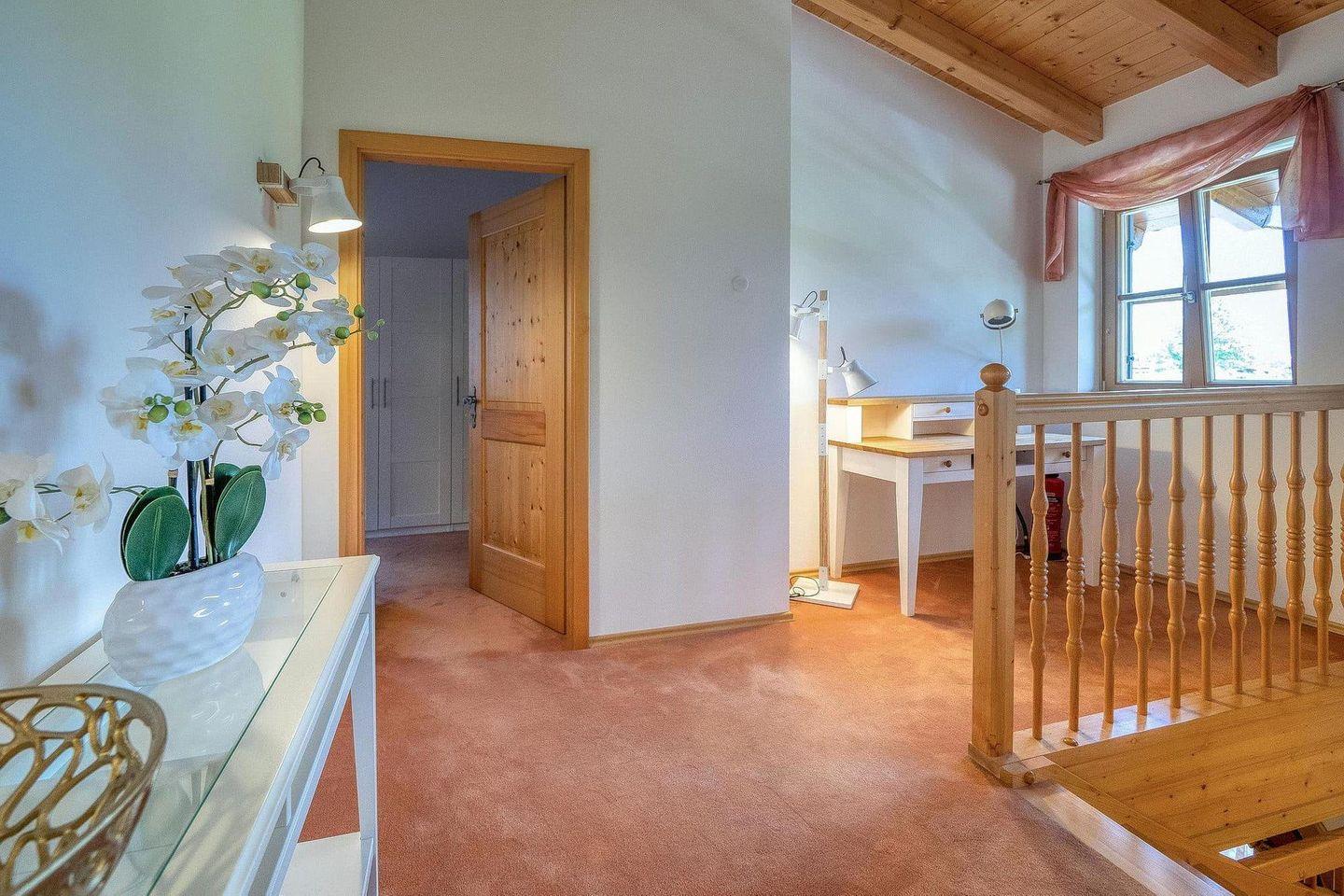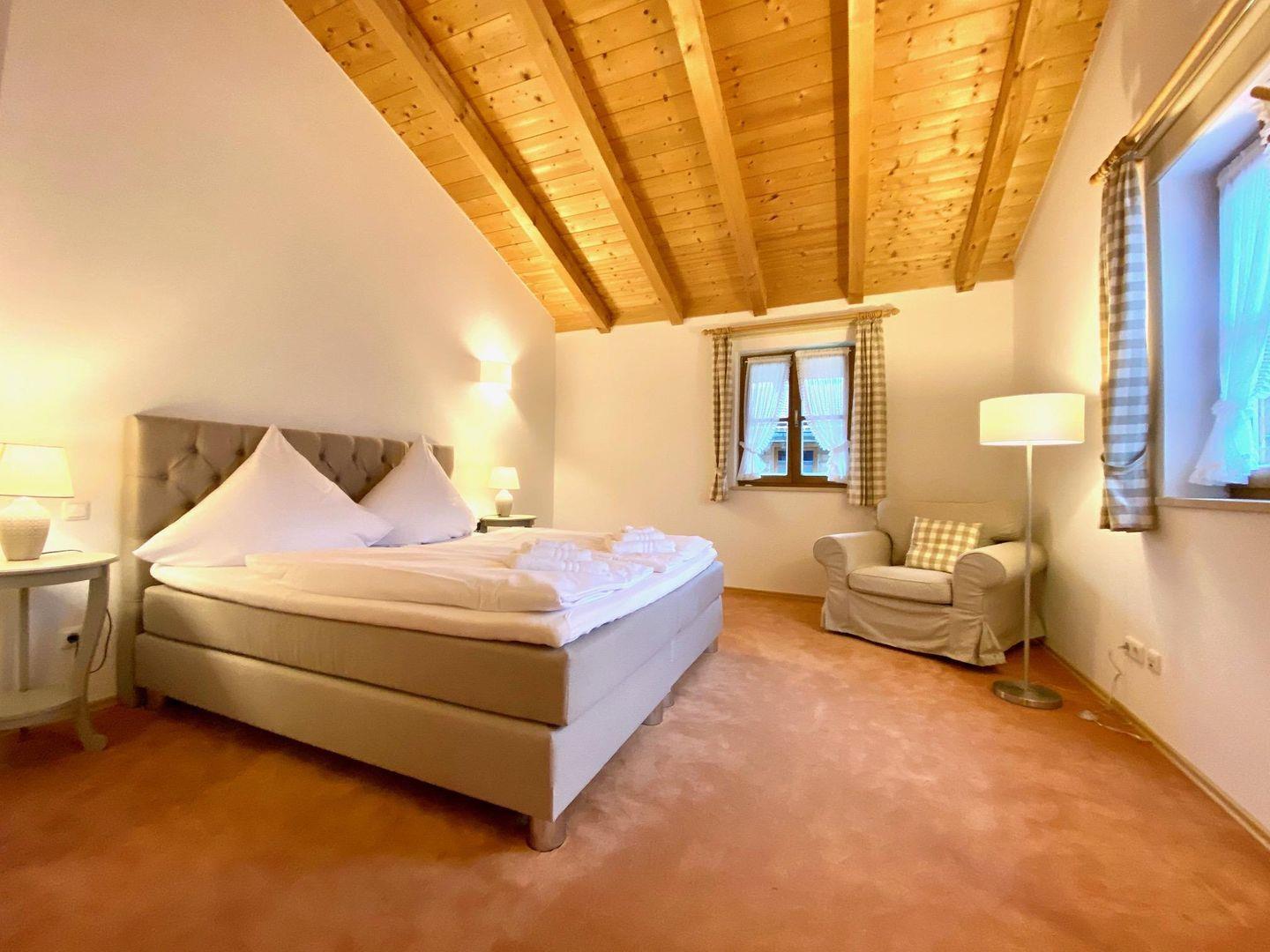 Das Obergeschoss beherbergt zwei stilvolle Schlafzimmer mit hochwertigen Boxspringbetten, eines davon mit ausziehbarem Schlafsofa und jeweils eigenem Bad. Eines der Bäder ist mit einer Badewanne ausgestattet – ideal zum Entspannen nach einem Tag in den Bergen.
