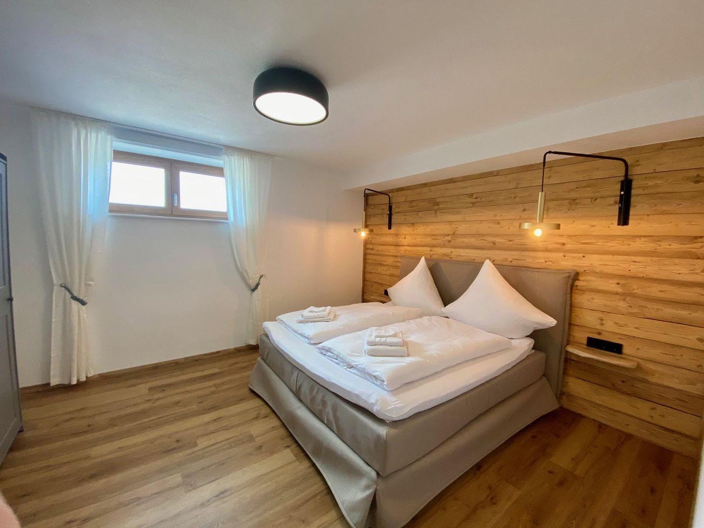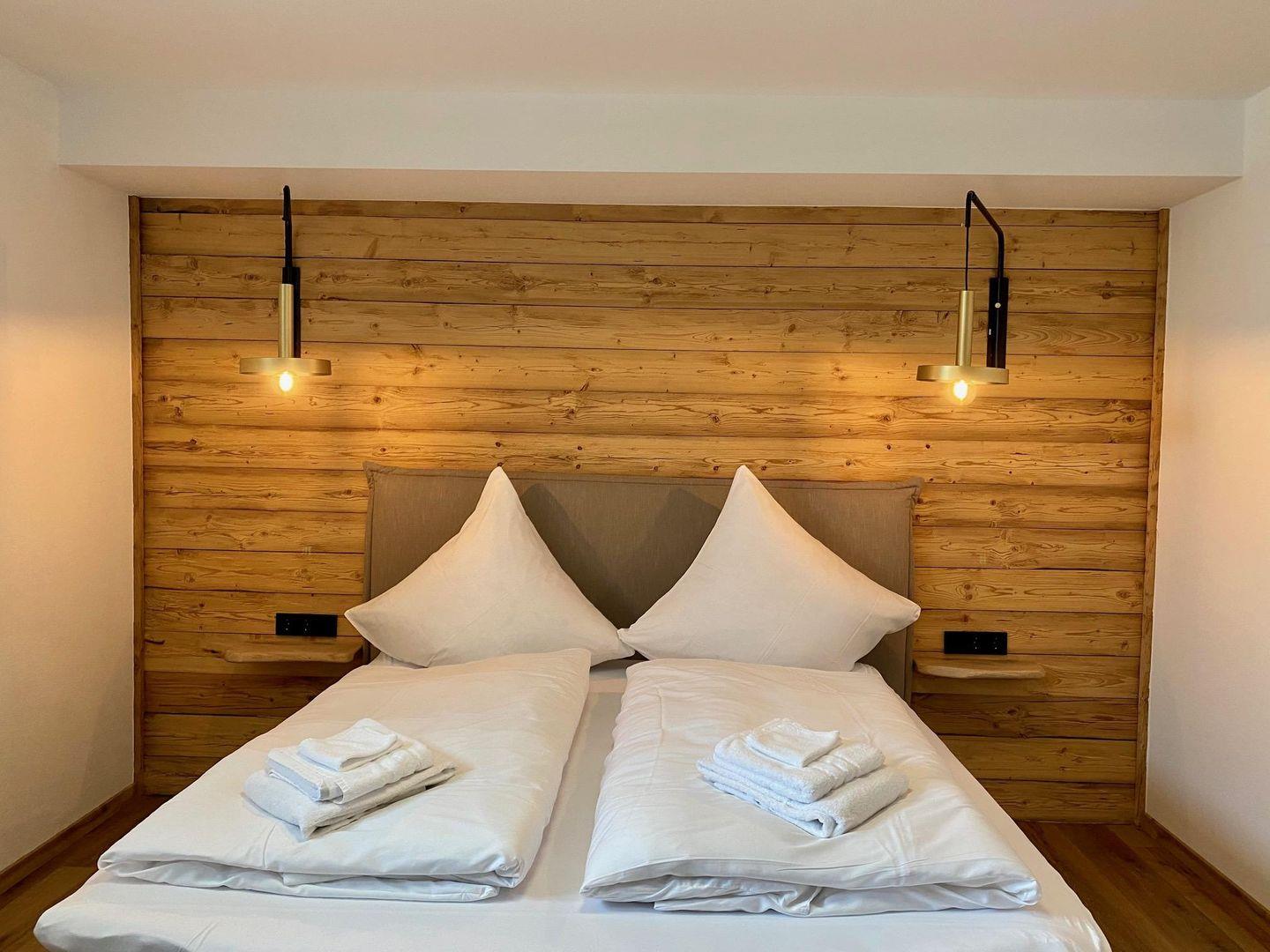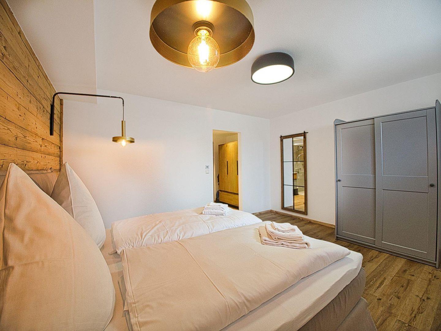 Das Schlafzimmer verfügt über ein komfortables Boxspringbett (180x200 cm) und einen Kleiderschrank. Das offen gestaltete Badezimmer mit bodentiefer Dusche grenzt direkt an. Ein separates WC bietet zusätzlich Waschmaschine, Bügeleisen und Bügelbrett.