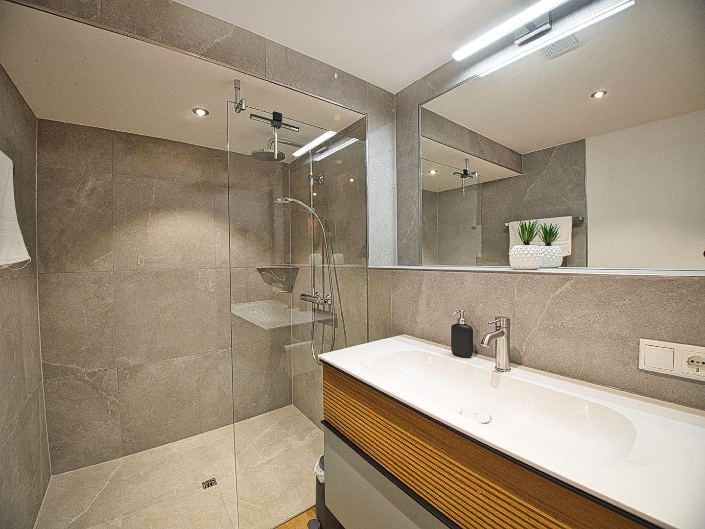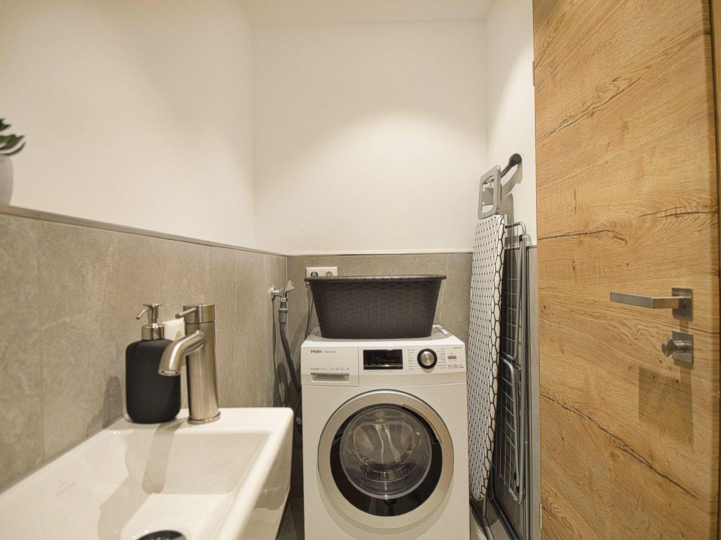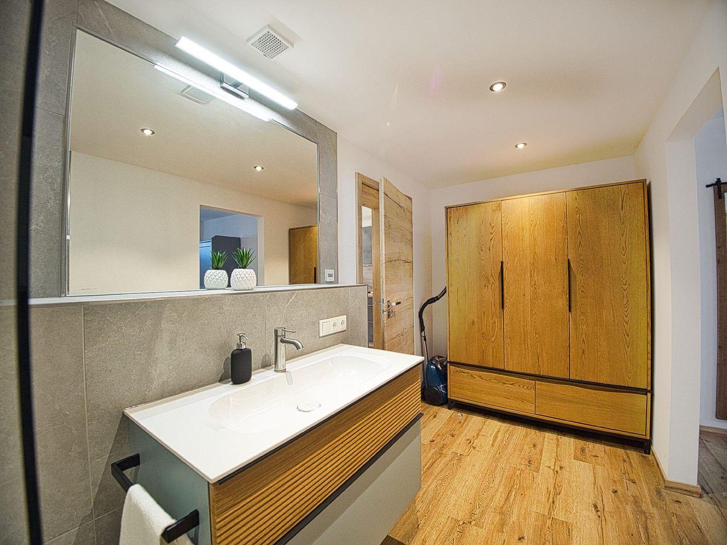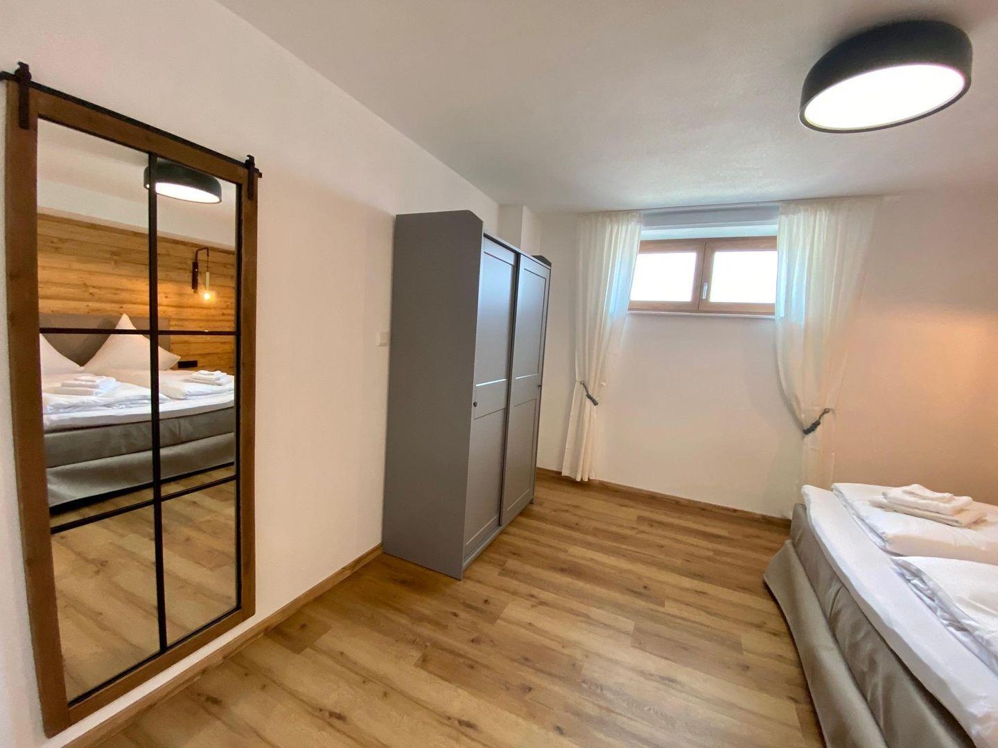 Das Schlafzimmer verfügt über ein komfortables Boxspringbett (180x200 cm) und einen Kleiderschrank. Das offen gestaltete Badezimmer mit bodentiefer Dusche grenzt direkt an. Ein separates WC bietet zusätzlich Waschmaschine, Bügeleisen und Bügelbrett.