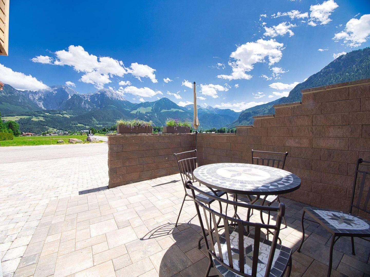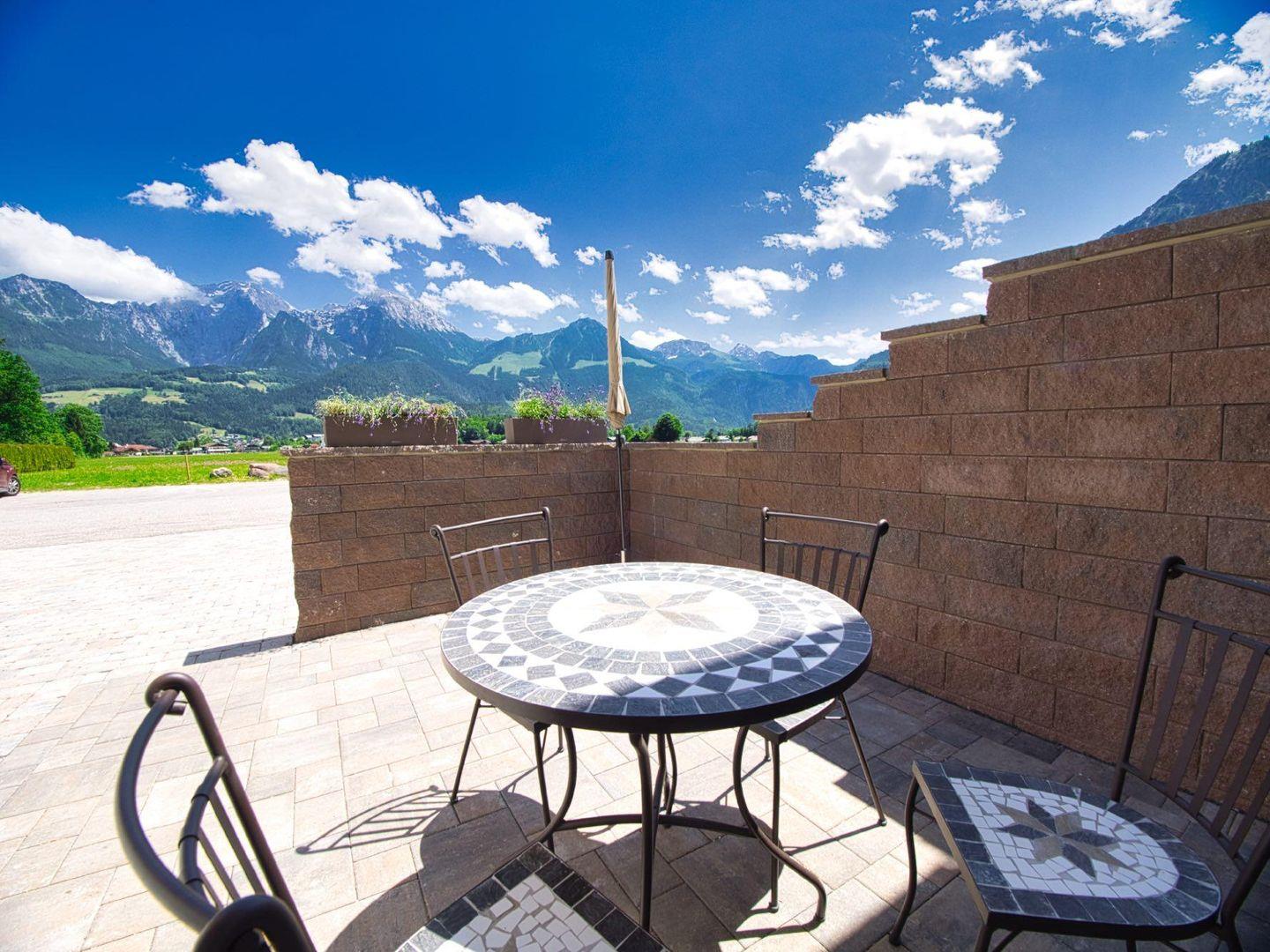 Ihre Terrasse mit Essbereich und Bergblick auf Hohen Göll, Brett und Jenner wird schnell zum Lieblingsplatz. Ein privater Parkplatz und eine gebührenpflichtige E-Ladestation sind vorhanden.