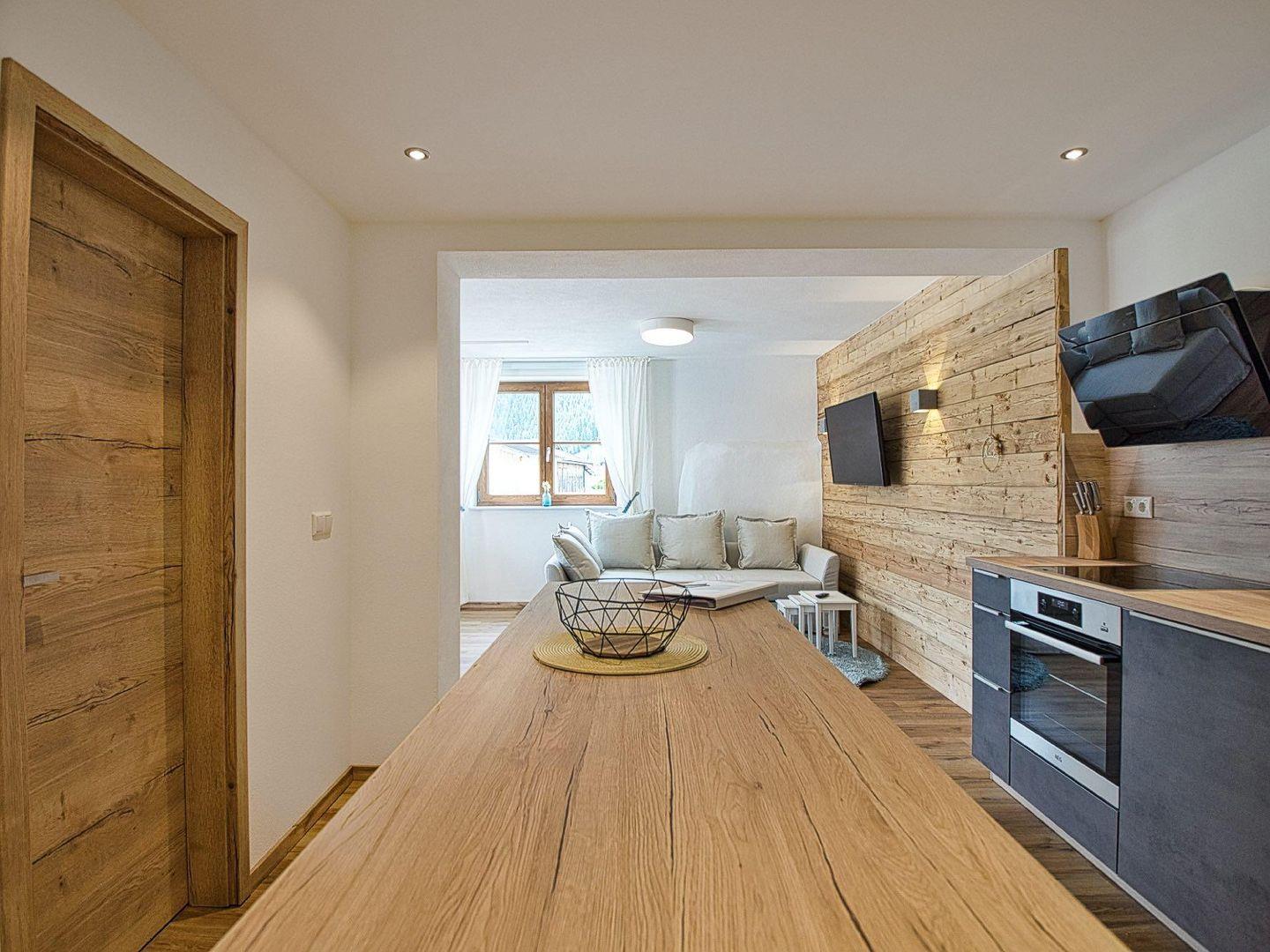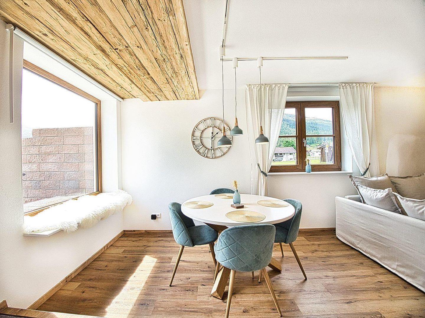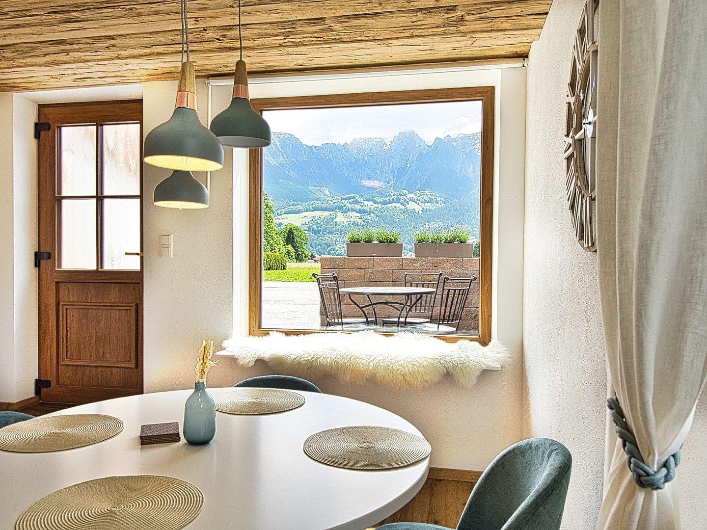 Das Herzstück der Wohnung ist der offene Wohn- und Essbereich. Eine Echtholz-verkleidete Wand schafft warme Atmosphäre. Am gemütlichen Esstisch ist Platz für 4 Personen, und durch das große Panoramafenster genießen Sie einen fantastischen Blick auf die Berchtesgadener Berge. Der Wohnbereich verfügt zudem über ein ausziehbares Schlafsofa und einen Smart-TV.