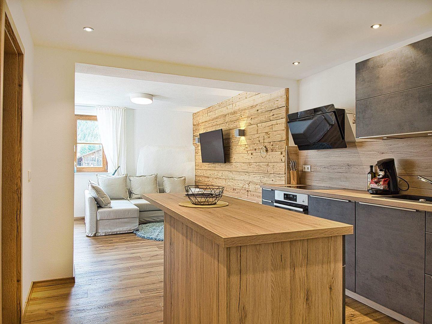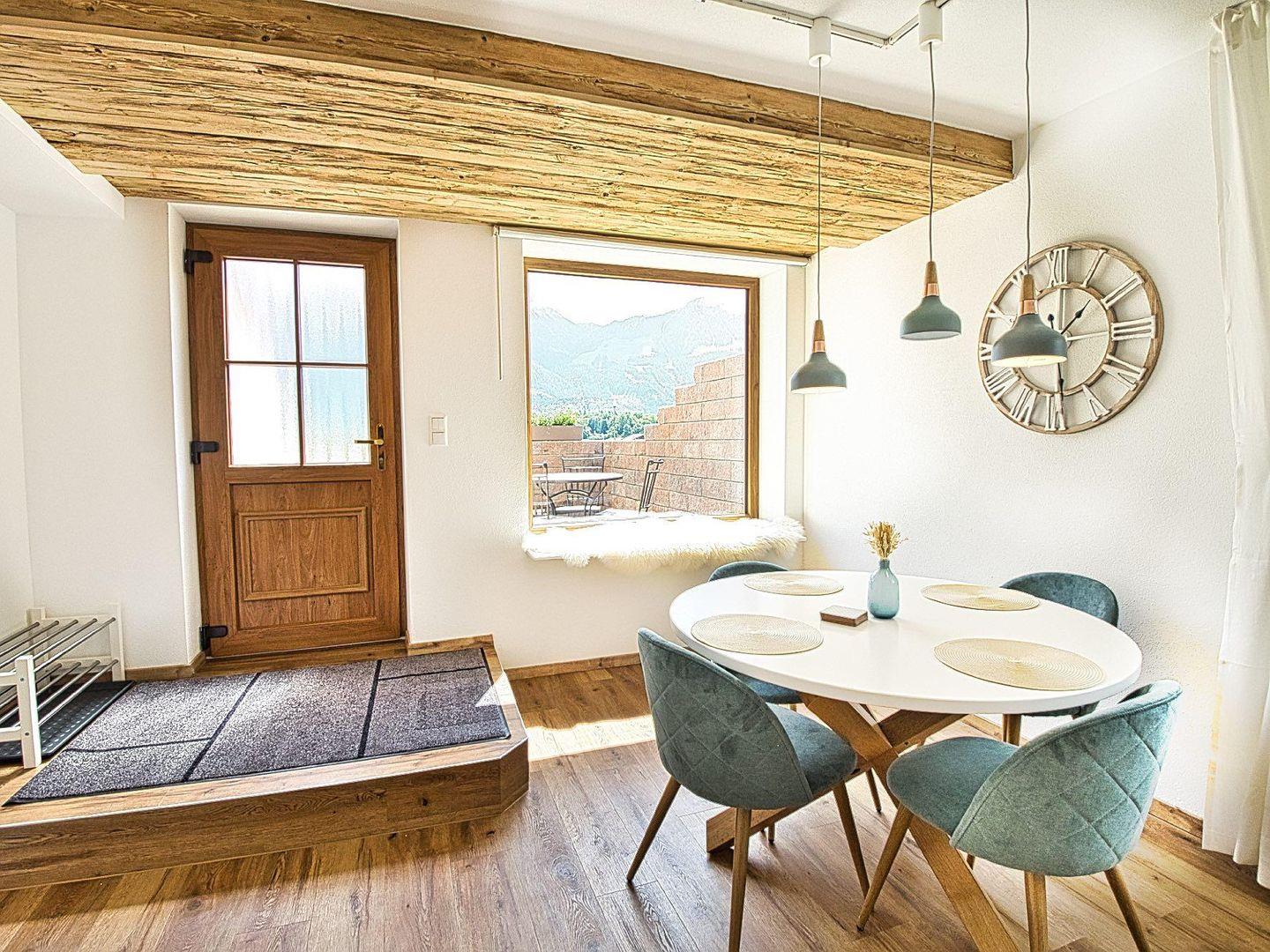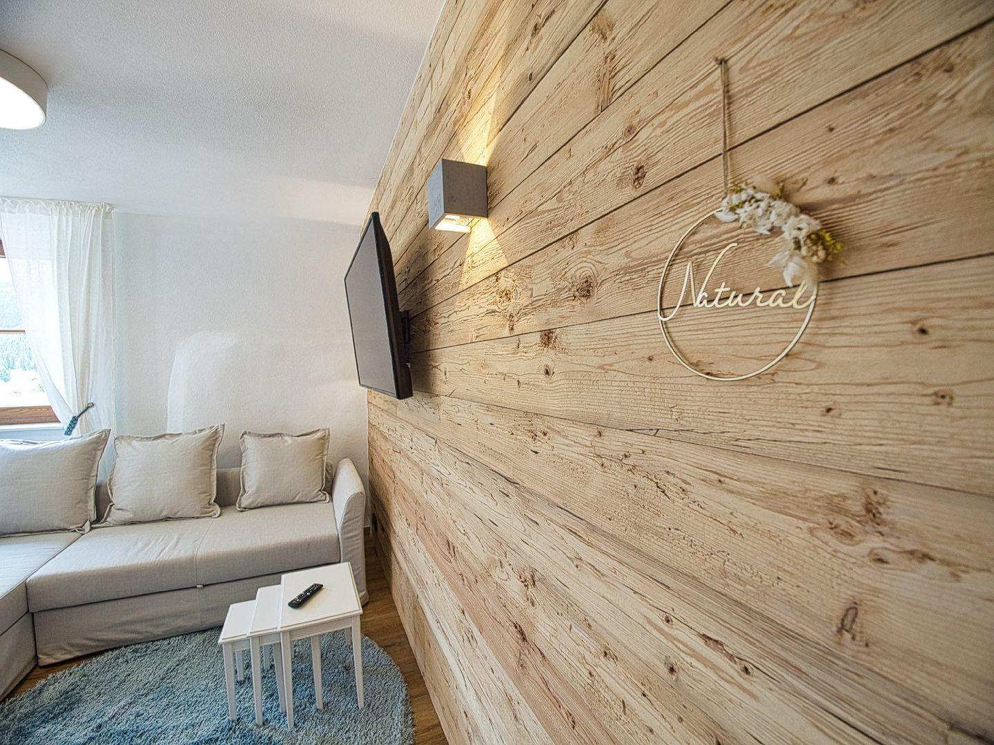 Das Herzstück der Wohnung ist der offene Wohn- und Essbereich. Eine Echtholz-verkleidete Wand schafft warme Atmosphäre. Am gemütlichen Esstisch ist Platz für 4 Personen, und durch das große Panoramafenster genießen Sie einen fantastischen Blick auf die Berchtesgadener Berge. Der Wohnbereich verfügt zudem über ein ausziehbares Schlafsofa und einen Smart-TV.
