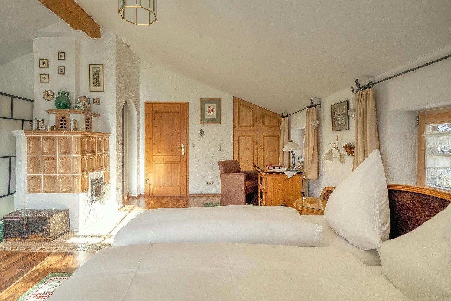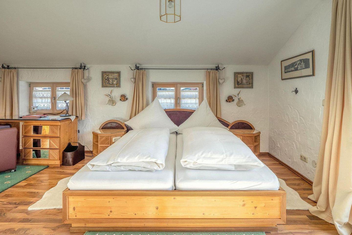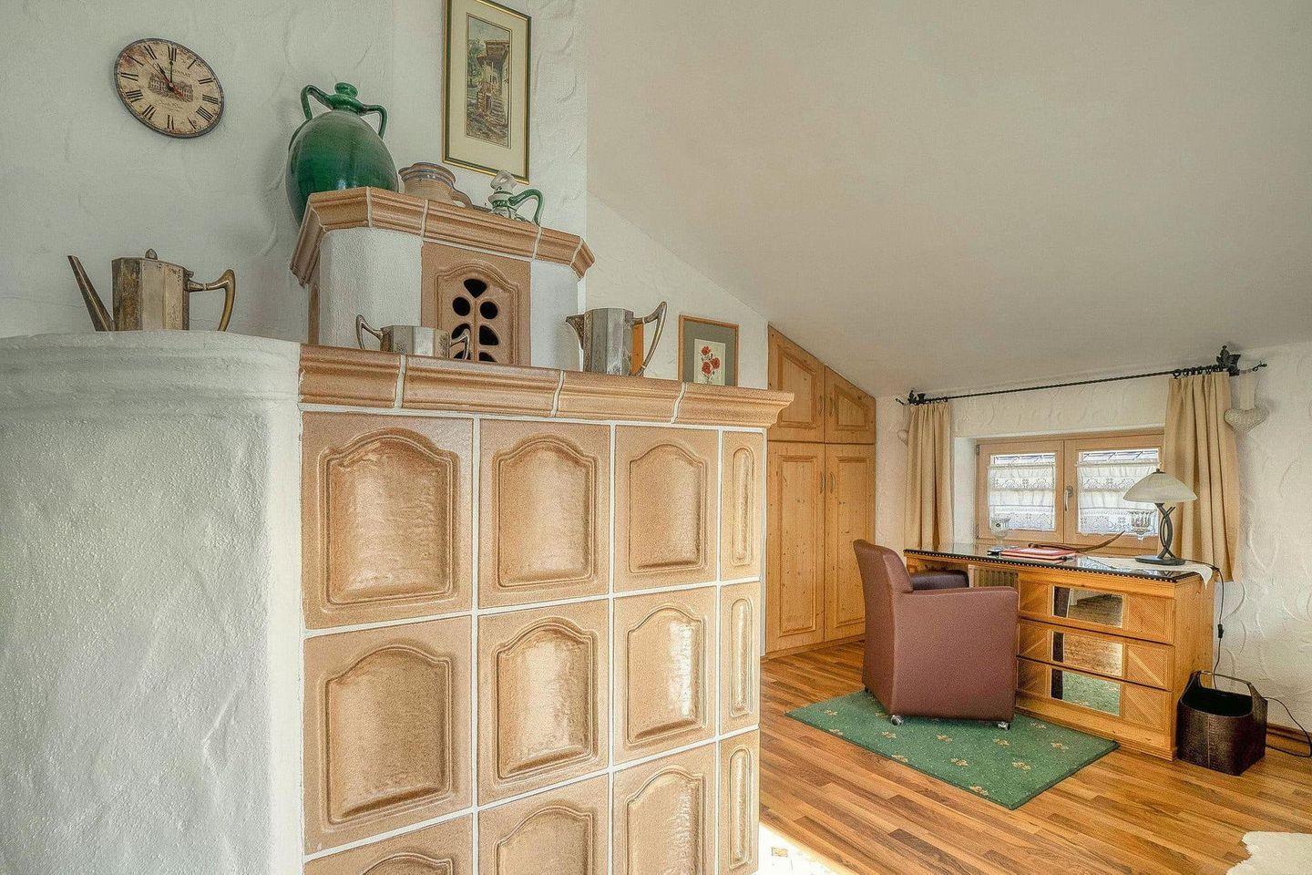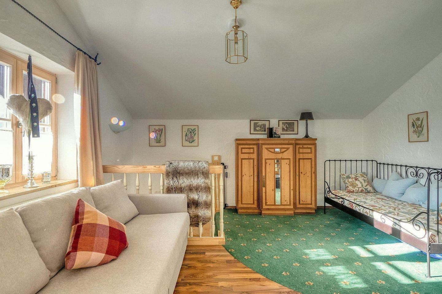 Über eine Wendeltreppe aus Echtholz gelangen Sie ins Obergeschoss. Dort erwartet Sie ein großzügiges Schlafzimmer mit Doppelbett, zusätzlichem Einzelbett und einem ausziehbaren Schlafsofa. Ein Schreibtisch und liebevoll eingebaute Schränke schaffen zusätzlichen Komfort. Als besonderes Highlight sorgt ein traditioneller Kachelofen für wohlige Wärme und heimelige Atmosphäre – perfekt, wenn draußen der Schnee fällt oder die Abende frisch sind. Vom Balkon aus eröffnet sich ein grandioser Blick auf Kehlsteinhaus, Jenner, Hohes Brett und Hoher Göll.