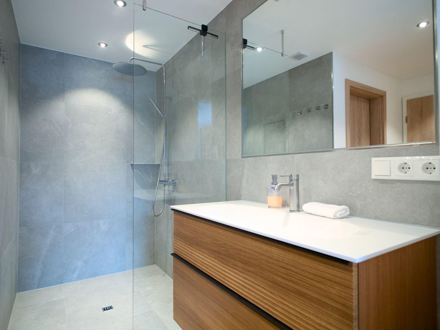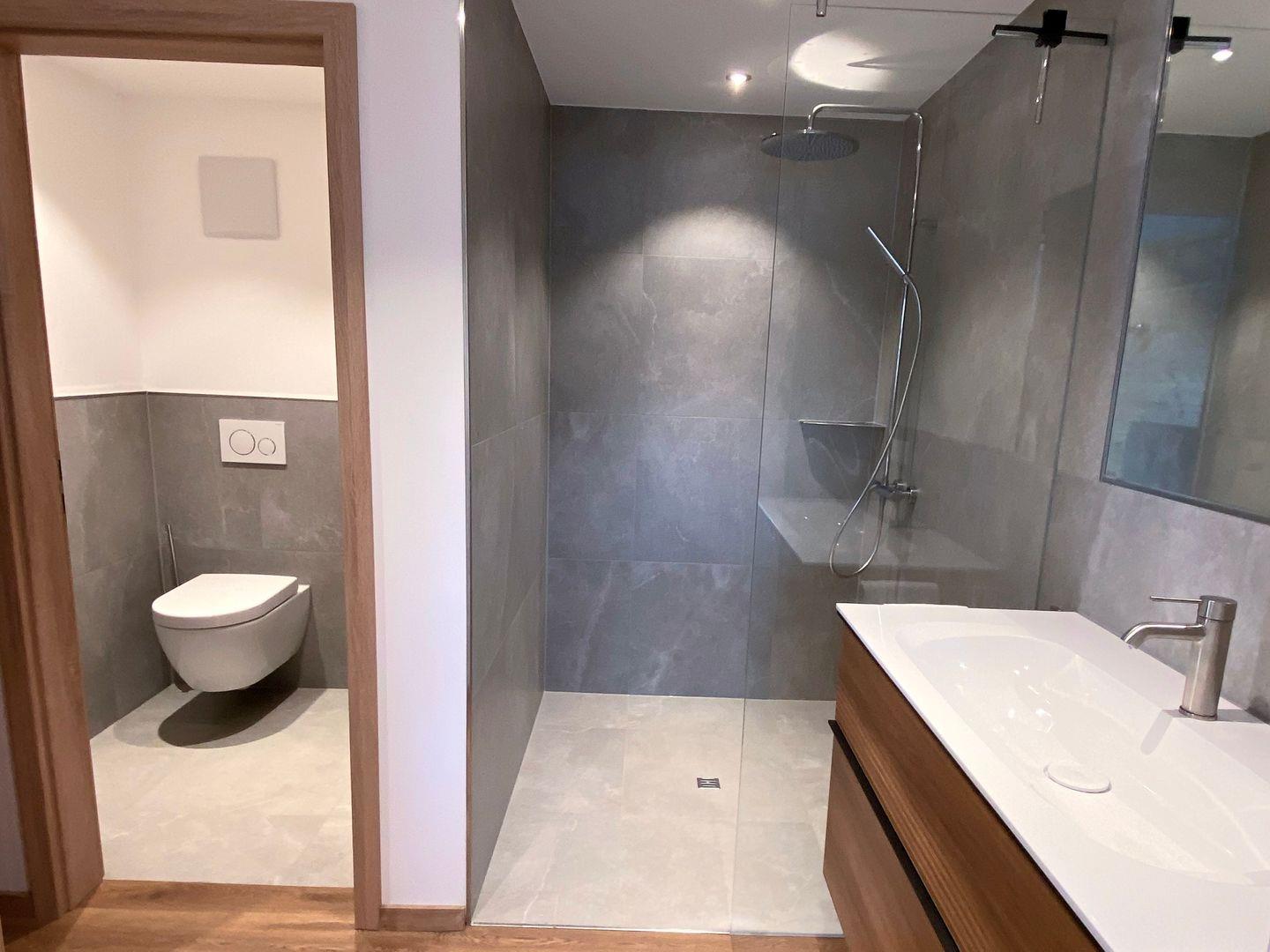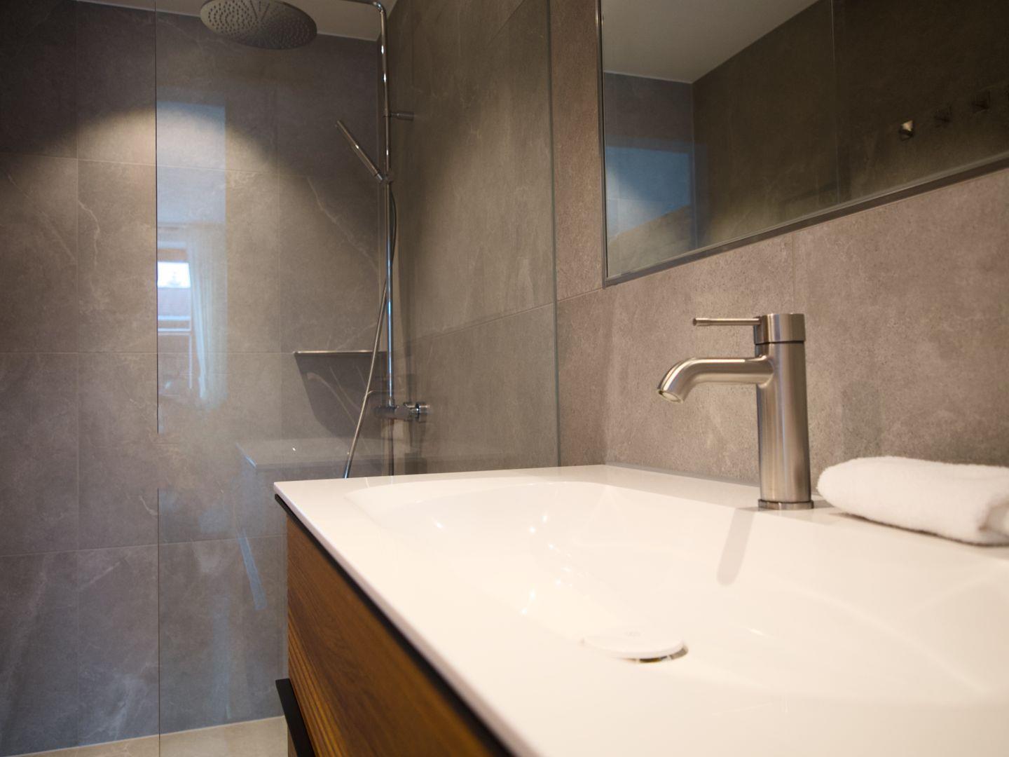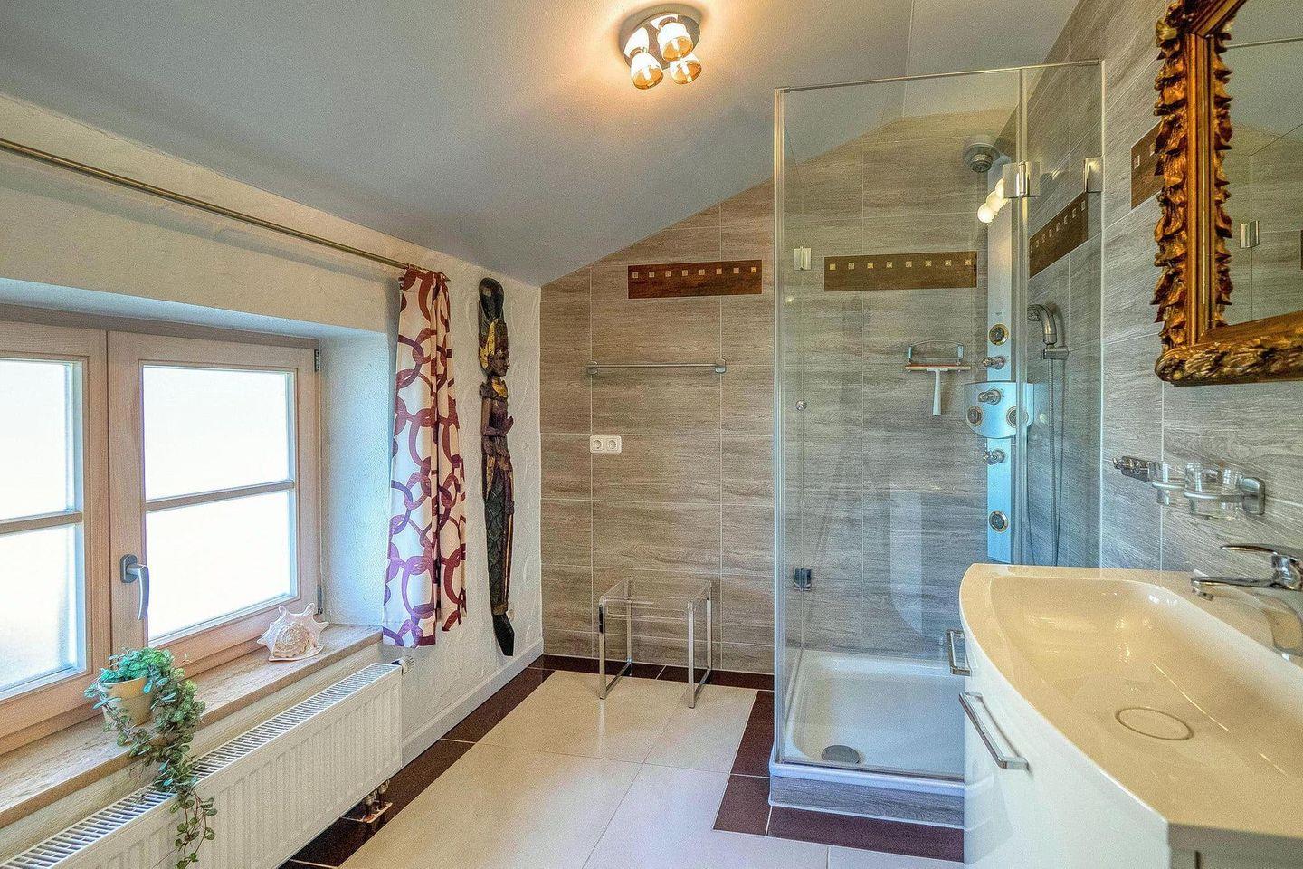Das Obergeschoss bietet ein Tageslichtbad mit Echtglasdusche und großem Waschtisch. Eine zusätzliche Toilette mit Handtuchtrockner und Waschmaschine macht den Aufenthalt besonders komfortabel.