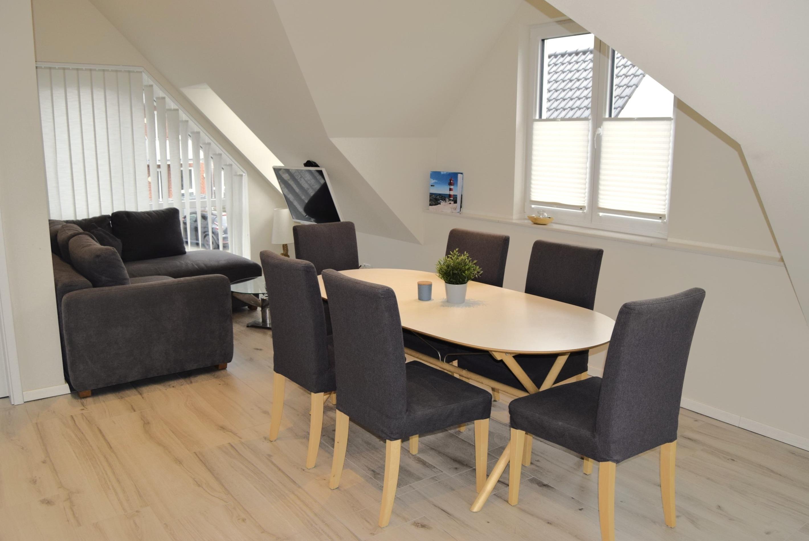 In unserem schönen Ferienhaus "Haus Stüürmann" direkt hinter dem Deich ist das die tägliche Erholung. Die großen Fenster sorgen für ein lichtdurchflutetes Obergeschoss mit Wohnzimmer, Essbereich und offener Küche für geselliges Beisammensein.