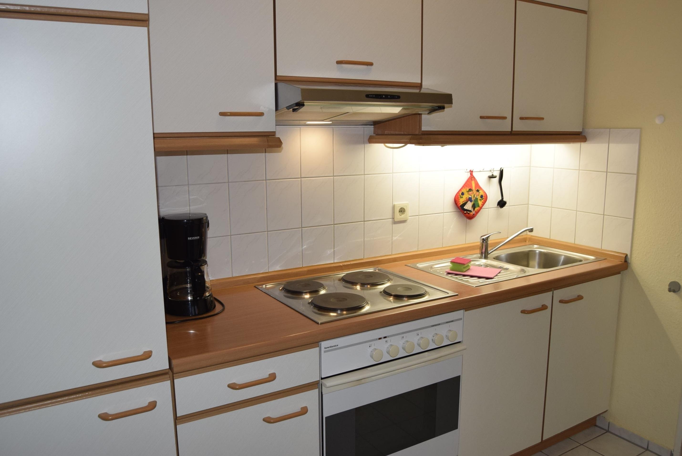 Von der Kaffeemaschine über den Kühlschrank mit Gefrierfach bis hin zum Wasserkocher und Toaster ist alles vorhanden.