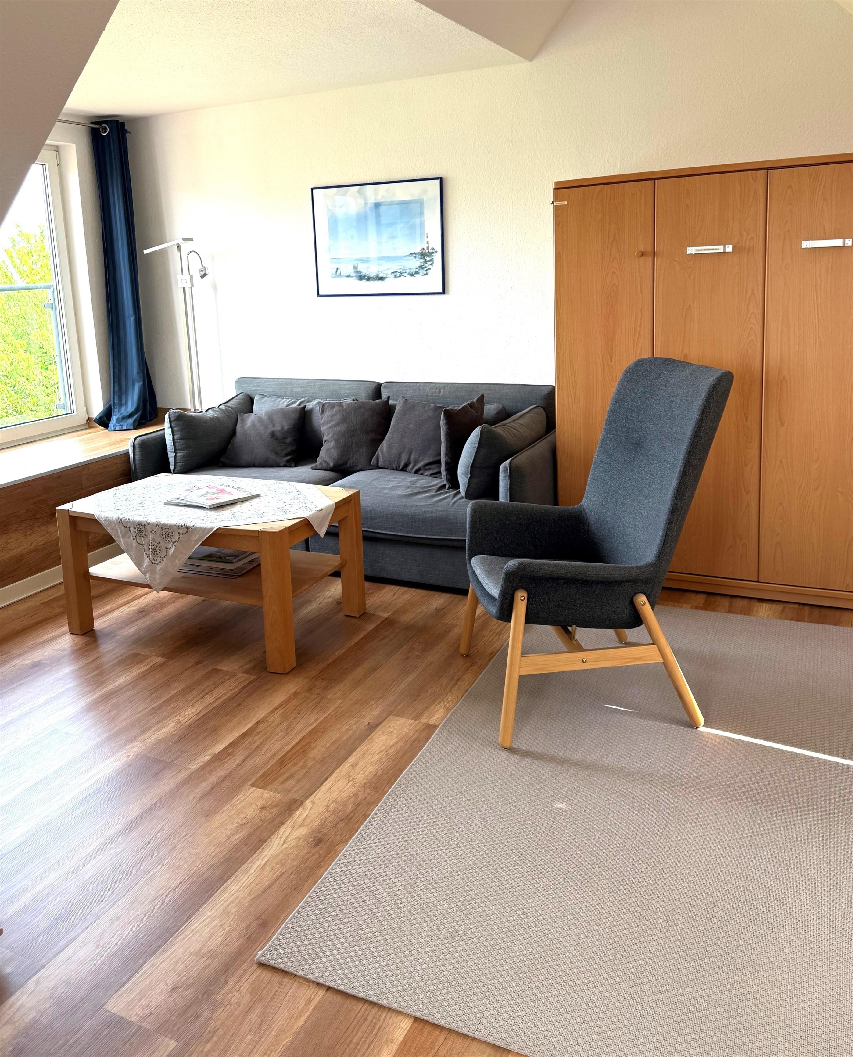 2.OG: Ein kombiniertes Wohn-Schlafzimmer mit Schrankbett im Dachgeschoss (über eine Wendeltreppe von der Küche aus erreichbar). Panoramafenster mit Seeblick und breiter Sitz-Fensterbank. Dieses Zimmer ist nicht abschließbar, somit offen zur Küche.
