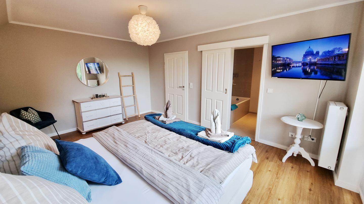 Schlafzimmer I: Boxspring-Doppelbett (180x200cm) / Schrank / Fernseher / Verdunkelungsgardinen / Duschbad en Suite