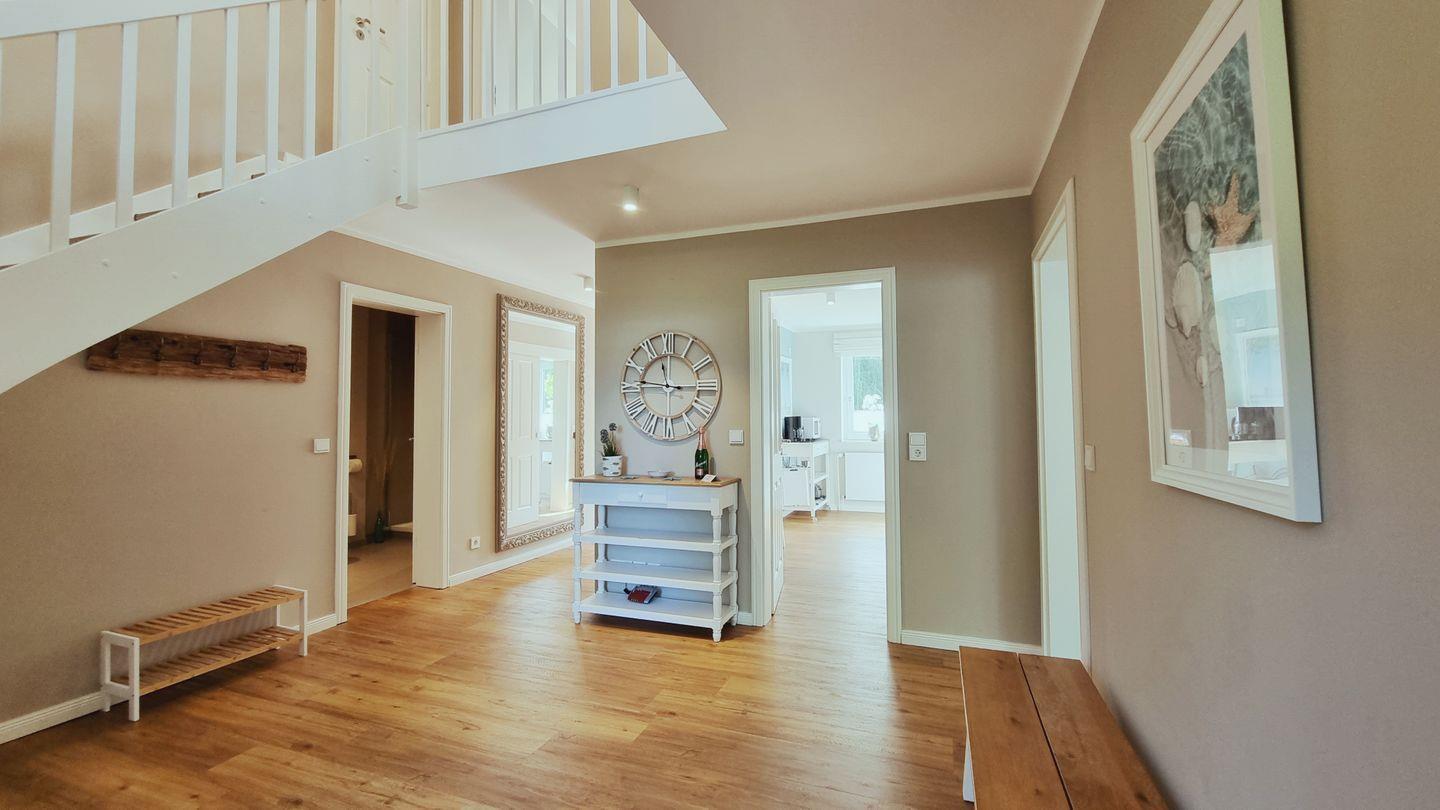 Zusatzausstattung: 2 PKW-Stellplätze / Waschmaschine / Trockner / WLAN / Kinderreisebett / Kinderhochstuhl / Wäscheständer / Fahrradunterstellmöglichkeit / Bollerwagen / Bügeleisen / Bügelbrett / Netflix / Wallbox (kostenpflichtig) / Bücher / Spiele