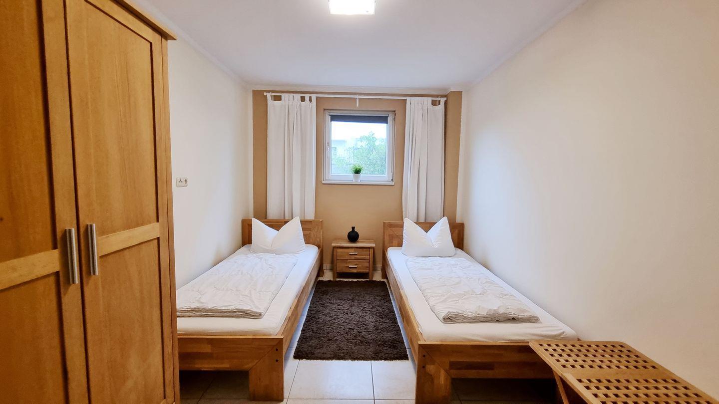 Schlafzimmer II: 2 Einzelbetten (90x200cm) / Kommode / Gardinen / Rollo / Fliegengitter
