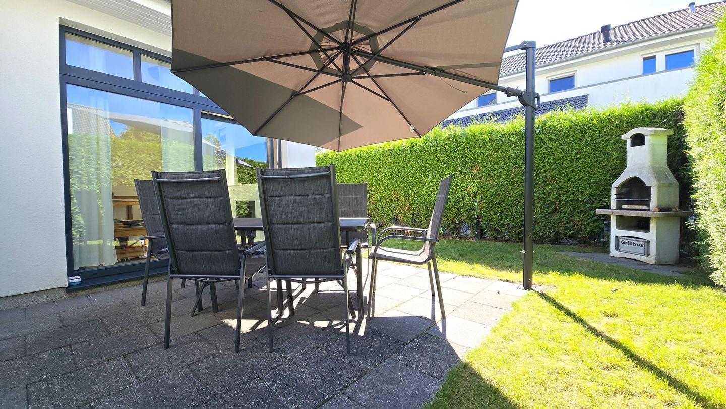 Garten und Terrasse: Tisch / 6 Stühle / Sonnenschirm / Holzkohlegrill / feste Wellenliege (120cm breit) / eingezäunt und eingewachsen