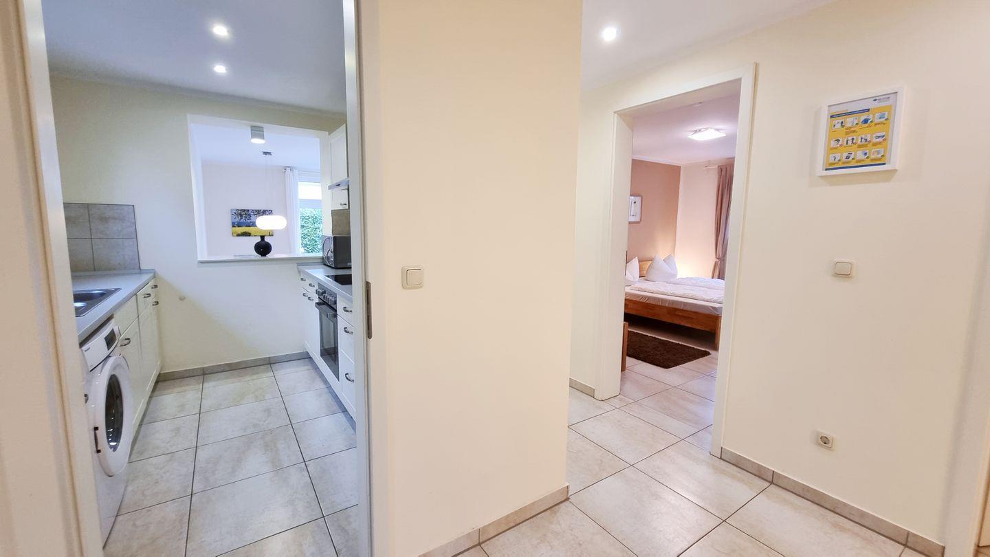 Küche: helle Küche / Cerankochfeld / Dunstabzugshaube / Backofen / Geschirrspüler / Mikrowelle / Toaster / Filterkaffeemaschine / Senseo Kapselmaschine / Wasserkocher / Kühlschrank / separierter halber Gefrierschrank mit 3-Fächern