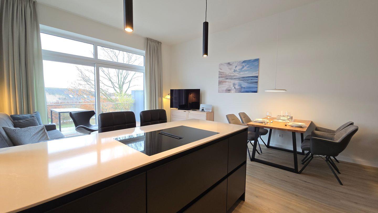 Küche: luxuriöse, offene Küche / Dunstabzug in das Induktionsfeld integriert / Backofen / kleiner (halber)Geschirrspüler / Toaster / Kaffeemaschine (Bohnen und Pulver) / Wasserkocher / Kühlschrank / separierter halber Gefrierschrank mit 3-Fächern / Mikrowelle / Mixer