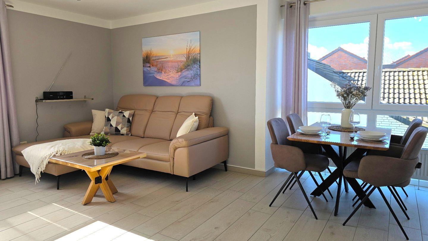 Wohn- Essbereich: gemütliche Couch / Fernseher / Esstisch / 4 Stühle