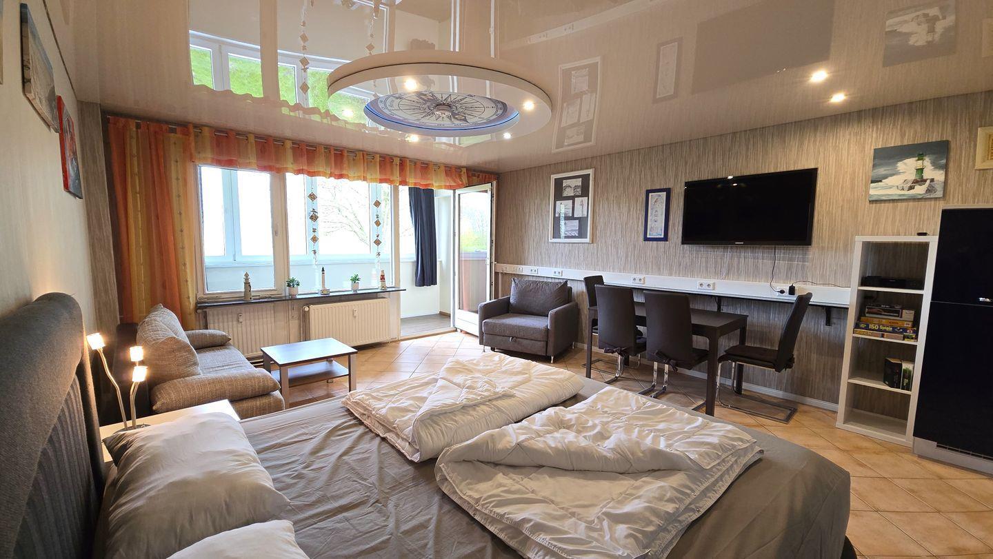 Wohn-/Essbereich: Schlafcouch (130x200cm) / Schlafsessel (80x200cm) / Fernseher / Esstisch / 4 Stühle