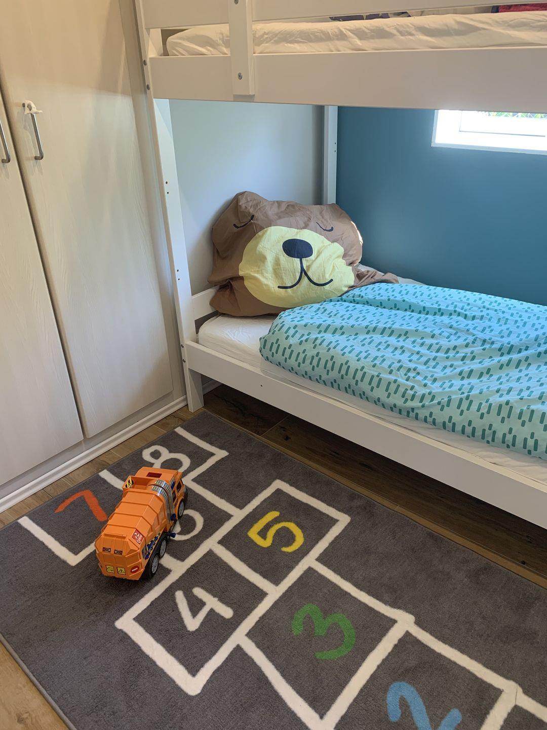 Das Ferienhaus verfügt über zwei gemütliche Schlafzimmer im Erdgeschoss. Das erste Schlafzimmer bietet ein komfortables Doppelbett mit Vorhängen und Rollos für eine angenehme Nachtruhe. Ein geräumiger Kleiderschrank bietet ausreichend Platz für Ihre persönlichen Gegenstände. Im zweiten Schlafzimmer finden Sie ein Etagenbett, das perfekt für die Kinder geeignet ist. Auch hier sorgen Vorhänge und Rollos für Privatsphäre, während ein Schreibtisch den Raum funktional abrundet.