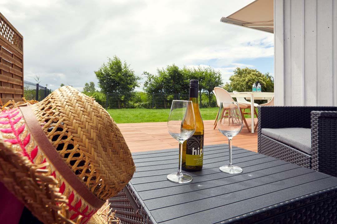 Der Wohnbereich des Ferienhauses bietet ein bequemes Sofa und eine große Fensterfront, die viel natürliches Licht hereinlässt und einen herrlichen Ausblick auf die Umgebung bietet. Entspannen Sie sich hier beim Lesen, Schauen Sie sich einen Film auf dem Flachbildfernseher an oder nutzen Sie das vorhandene DSL/WLAN-Internet, um mit Ihren Lieben in Kontakt zu bleiben.